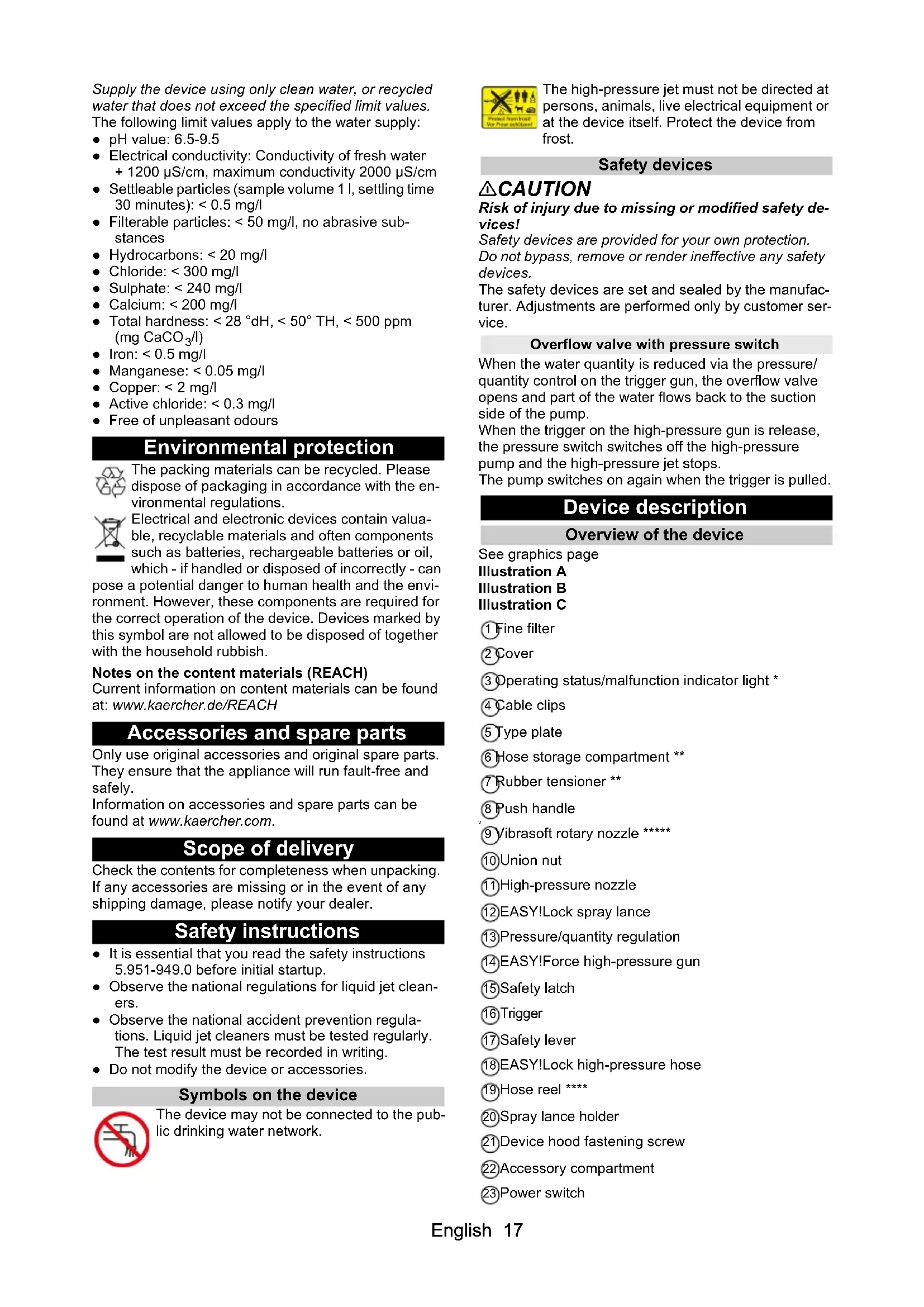 /l) ● Iron: < 0.5 mg/l ● Manganese: < 0.05 mg/l ● Copper: < 2 mg/l ● Active chloride: < 0.3 mg/l ● Free of unpleasant odours Environmental protection The packing materials can be recycled. Please dispose of packaging in accordance with the en- vironmental regulations. Electrical and electronic devices contain valua- ble, recyclable materials and often components such as batteries, rechargeable batteries or oil, which - if handled or disposed of incorrectly - can pose a potential danger to human health and the envi- ronment. However, these components are required for the correct operation of the device. Devices marked by this symbol are not allowed to be disposed of together with the household rubbish. Notes on the content materials (REACH) Current information on content materials can be found at: www.kaercher.de/REACH Accessories and spare parts Only use original accessories and original spare parts. They ensure that the appliance will run fault-free and safely. Information on accessories and spare parts can be found at www.kaercher.com. Scope of delivery Check the contents for completeness when unpacking. If any accessories are missing or in the event of any shipping damage, please notify your dealer. Safety instructions ● It is essential that you read the safety instructions 5.951-949.0 before initial startup. ● Observe the national regulations for liquid jet clean- ers. ● Observe the national accident prevention regula- tions. Liquid jet cleaners must be tested regularly. The test result must be recorded in writing. ● Do not modify the device or accessories. Symbols on the device The device may not be connected to the pub- lic drinking water network. The high-pressure jet must not be directed at persons, animals, live electrical equipment or at the device itself. Protect the device from frost. Safety devices 몇 CAUTION Risk of injury due to missing or modified safety de- vices! Safety devices are provided for your own protection. Do not bypass, remove or render ineffective any safety devices. The safety devices are set and sealed by the manufac- turer. Adjustments are performed only by customer ser- vice. Overflow valve with pressure switch When the water quantity is reduced via the pressure/ quantity control on the trigger gun, the overflow valve opens and part of the water flows back to the suction side of the pump. When the trigger on the high-pressure gun is release, the pressure switch switches off the high-pressure pump and the high-pressure jet stops. The pump switches on again when the trigger is pulled. Device description Overview of the device See graphics page Illustration A Illustration B Illustration C 1 Fine filter 2 Cover 3 Operating status/malfunction indicator light * 4 Cable clips 5 Type plate 6 Hose storage compartment ** 7 Rubber tensioner ** 8 Push handle