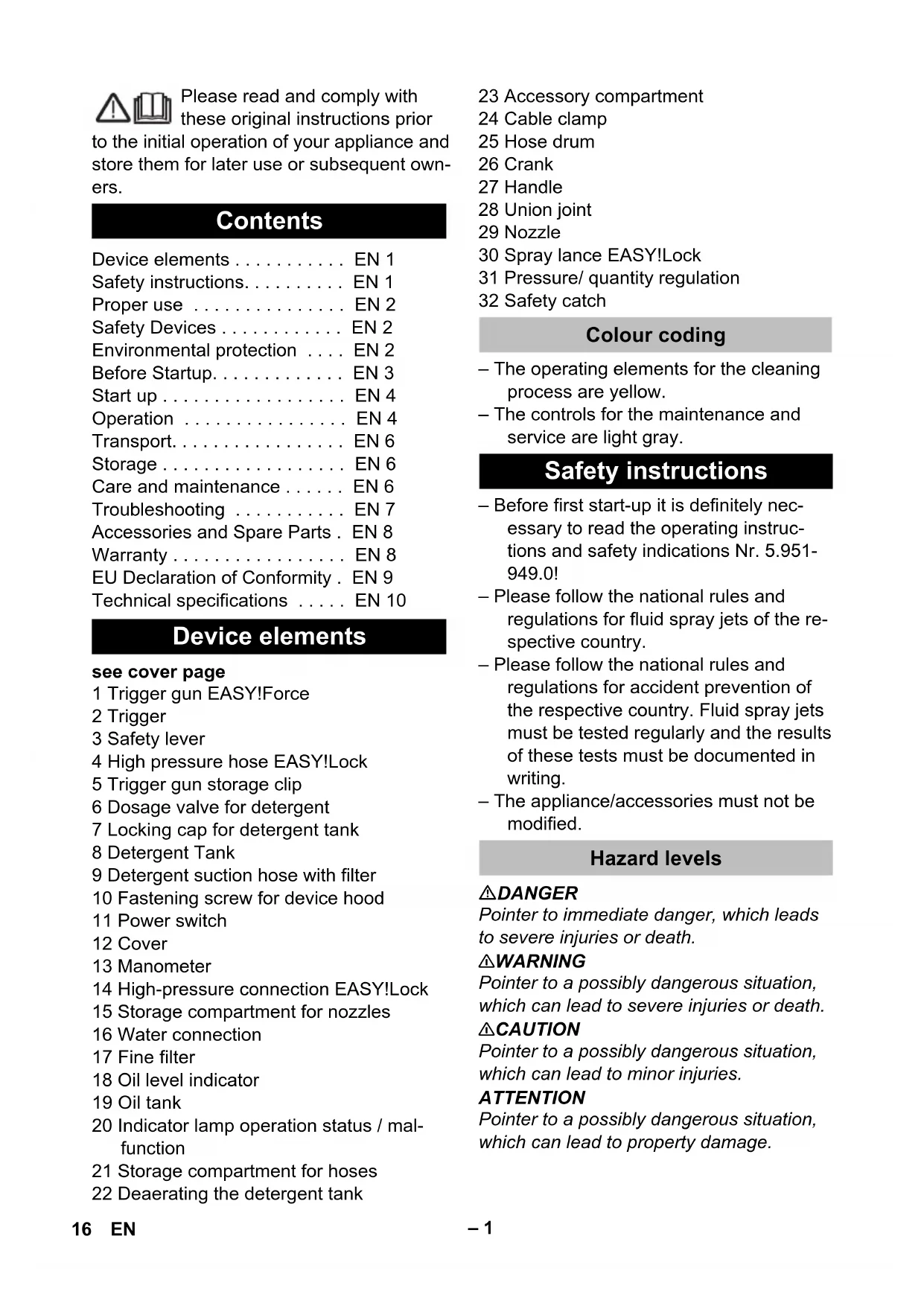 - 1.286-902.0: 75,5 kg; 1.286-903.0: 75,7 kg; 1.286-913.0: 69,1 kg; 1.286-927: 82,5 kg ** 1.286-914.0: 77,5 kg; 1.286-928.0: 86 kg 15DE– 1 Please read and comply with these original instructions prior to the initial operation of your appliance and store them for later use or subsequent own- ers. see cover page 1 Trigger gun EASY!Force 2 Trigger 3 Safety lever 4 High pressure hose EASY!Lock 5 Trigger gun storage clip 6 Dosage valve for detergent 7 Locking cap for detergent tank 8 Detergent Tank 9 Detergent suction hose with filter 10 Fastening screw for device hood 11 Power switch 12 Cover 13 Manometer 14 High-pressure connection EASY!Lock 15 Storage compartment for nozzles 16 Water connection 17 Fine filter 18 Oil level indicator 19 Oil tank 20 Indicator lamp operation status / mal- function 21 Storage compartment for hoses 22 Deaerating the detergent tank 23 Accessory compartment 24 Cable clamp 25 Hose drum 26 Crank 27 Handle 28 Union joint 29 Nozzle 30 Spray lance EASY!Lock 31 Pressure/ quantity regulation 32 Safety catch – The operating elements for the cleaning process are yellow. – The controls for the maintenance and service are light gray. – Before first start-up it is definitely nec- essary to read the operating instruc- tions and safety indications Nr. 5.951- 949.0! – Please follow the national rules and regulations for fluid spray jets of the re- spective country. – Please follow the national rules and regulations for accident prevention of the respective country. Fluid spray jets must be tested regularly and the results of these tests must be documented in writing. – The appliance/accessories must not be modified. DANGER Pointer to immediate danger, which leads to severe injuries or death. 몇 WARNING Pointer to a possibly dangerous situation, which can lead to severe injuries or death. 몇 CAUTION Pointer to a possibly dangerous situation, which can lead to minor injuries. ATTENTION Pointer to a possibly dangerous situation, which can lead to property damage. Contents Device elements . . . . . . . . . . . EN 1 Safety instructions. . . . . . . . . . EN 1 Proper use . . . . . . . . . . . . . . . EN 2 Safety Devices . . . . . . . . . . . . EN 2 Environmental protection . . . . EN 2 Before Startup. . . . . . . . . . . . . EN 3 Start up . . . . . . . . . . . . . . . . . . EN 4 Operation . . . . . . . . . . . . . . . . EN 4 Transport. . . . . . . . . . . . . . . . . EN 6 Storage . . . . . . . . . . . . . . . . . . EN 6 Care and maintenance . . . . . . EN 6 Troubleshooting . . . . . . . . . . . EN 7 Accessories and Spare Parts . EN 8 Warranty . . . . . . . . . . . . . . . . . EN 8 EU Declaration of Conformity . EN 9 Technical specifications . . . . . EN 10 Device elements Colour coding Safety instructions Hazard levels 16 EN– 2 High-pressure jets can be dan- gerous if improperly used. The jet may not be directed at persons, animals, live electrical equipment or at the appliance itself. According to applicable regula- tions, the appliance must never be used on the drinking water net without a system separator. A suit- able system separator by KÄRCHER or al- ternatively a system separator according to EN 12729 type BA must be used. Water that was flowing through a system separator is considered non-drinkable. 몇 CAUTION Always connect the system separator to the water supply, never directly to the appli- ance! Use this high pressure cleaner exclusively for – Cleaning using low pressure jet and de- tergent (for e.g. for cleaning machines, cars, buildings, tools), – For cleaning using high pressure jet without detergent (for e.g. for cleaning facades, terraces, garden appliances). For stubborn dirt, we recommend the use of the dirt blaster as a special accessory. Quality requirements for water: ATTENTION Only clean water may be used as high pressure medium. Impurities will lead to in- creased wear and tear or formation of de- posits in the appliance. If recycled water is used, the following limit values must not be exceeded. Safety devices serve to protect the user and must not be rendered in operational or their functions bypassed. While reducing the water supply/quantity regulation at the pump head, the overflow valve opens and part of the water flows back to the pump suck side. If the pulling lever on the trigger gun is re- leased the pressure switch turns off the pump, the high-pressure jet is stopped. If the pulling lever is pulled the pump is turned on again. The overflow valve and pressure switch are set and sealed at the factory. Setting only by customer service. Symbols on the machine Proper use pH value 6,5...9,5 electrical conductivity * Conductivity fresh water +1200 µS/cm settleable solids ** < 0,5 mg/l total suspended solids *** < 50 mg/l Hydrocarbons < 20 mg/l Chloride < 300 mg/l Sulphate < 240 mg/l Calcium < 200 mg/l Total hardness < 28 °dH < 50 °TH < 500 ppm (mg CaCO