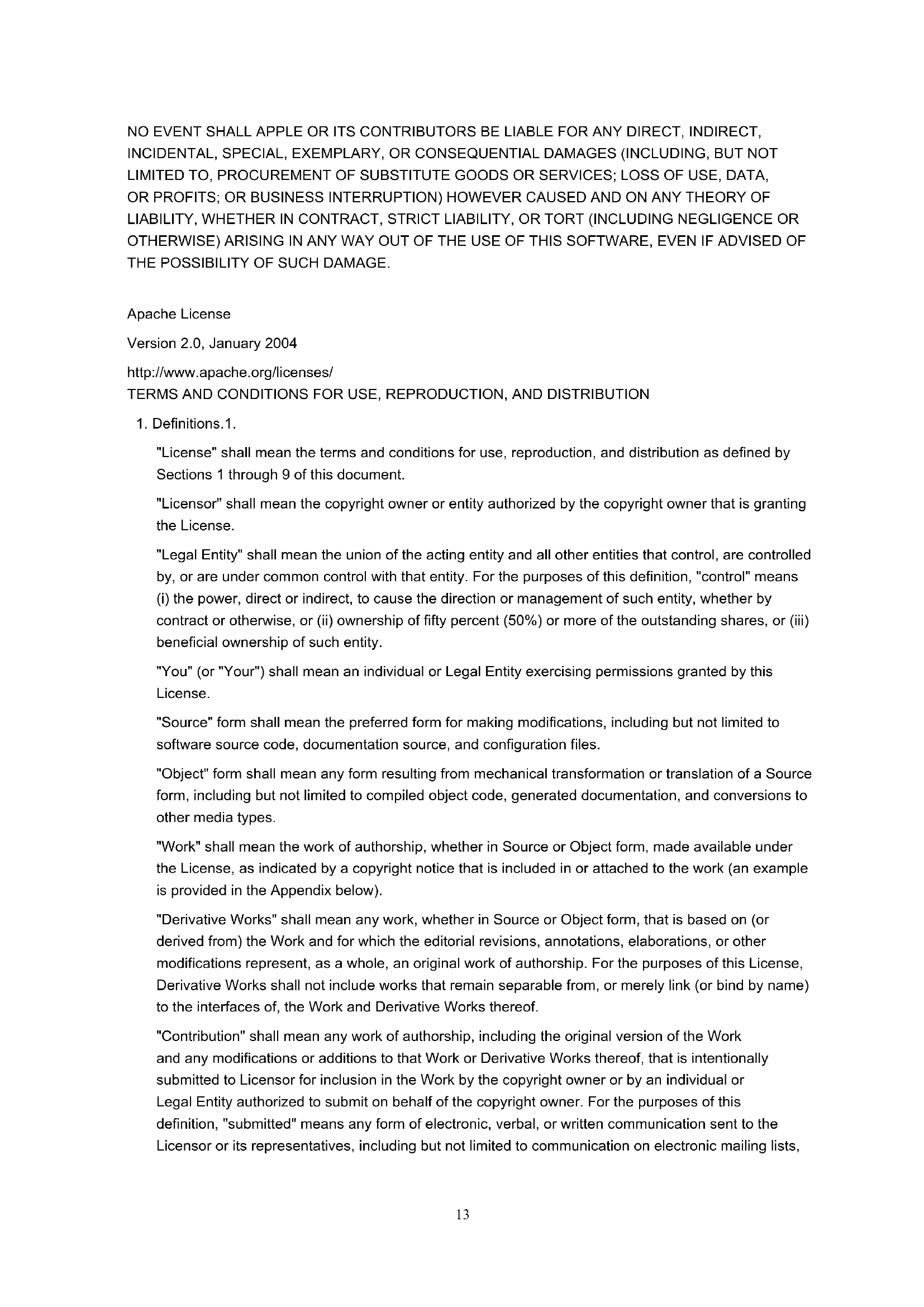 promote products derived from this software without specific prior written permission. THIS SOFTWARE IS PROVIDED BY APPLE AND ITS CONTRIBUTORS "AS IS" AND ANY EXPRESS OR IMPLIED WARRANTIES, INCLUDING, BUT NOT LIMITED TO, THE IMPLIED WARRANTIES OF MERCHANTABILITY AND FITNESS FOR A PARTICULAR PURPOSE ARE DISCLAIMED. IN 12NO EVENT SHALL APPLE OR ITS CONTRIBUTORS BE LIABLE FOR ANY DIRECT, INDIRECT, INCIDENTAL, SPECIAL, EXEMPLARY, OR CONSEQUENTIAL DAMAGES (INCLUDING, BUT NOT LIMITED TO, PROCUREMENT OF SUBSTITUTE GOODS OR SERVICES; LOSS OF USE, DATA, OR PROFITS; OR BUSINESS INTERRUPTION) HOWEVER CAUSED AND ON ANY THEORY OF LIABILITY, WHETHER IN CONTRACT, STRICT LIABILITY, OR TORT (INCLUDING NEGLIGENCE OR OTHERWISE) ARISING IN ANY WAY OUT OF THE USE OF THIS SOFTWARE, EVEN IF ADVISED OF THE POSSIBILITY OF SUCH DAMAGE. Apache License Version 2.0, January 2004 http://www.apache.org/licenses/ TERMS AND CONDITIONS FOR USE, REPRODUCTION, AND DISTRIBUTION