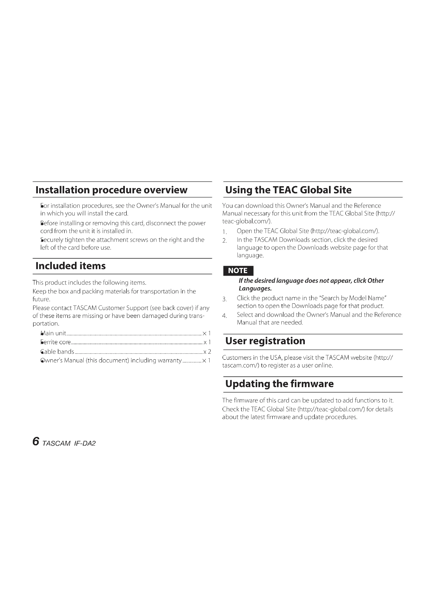 Select and download the Owner’s Manual and the Reference Manual that are needed. User registration Customers in the USA, please visit the TASCAM website (http:// tascam.com/) to register as a user online. Updating the firmware The firmware of this card can be updated to add functions to it. Check the TEAC Global Site (http://teac-global.com/) for details about the latest firmware and update procedures.TASCAM IF-DA2