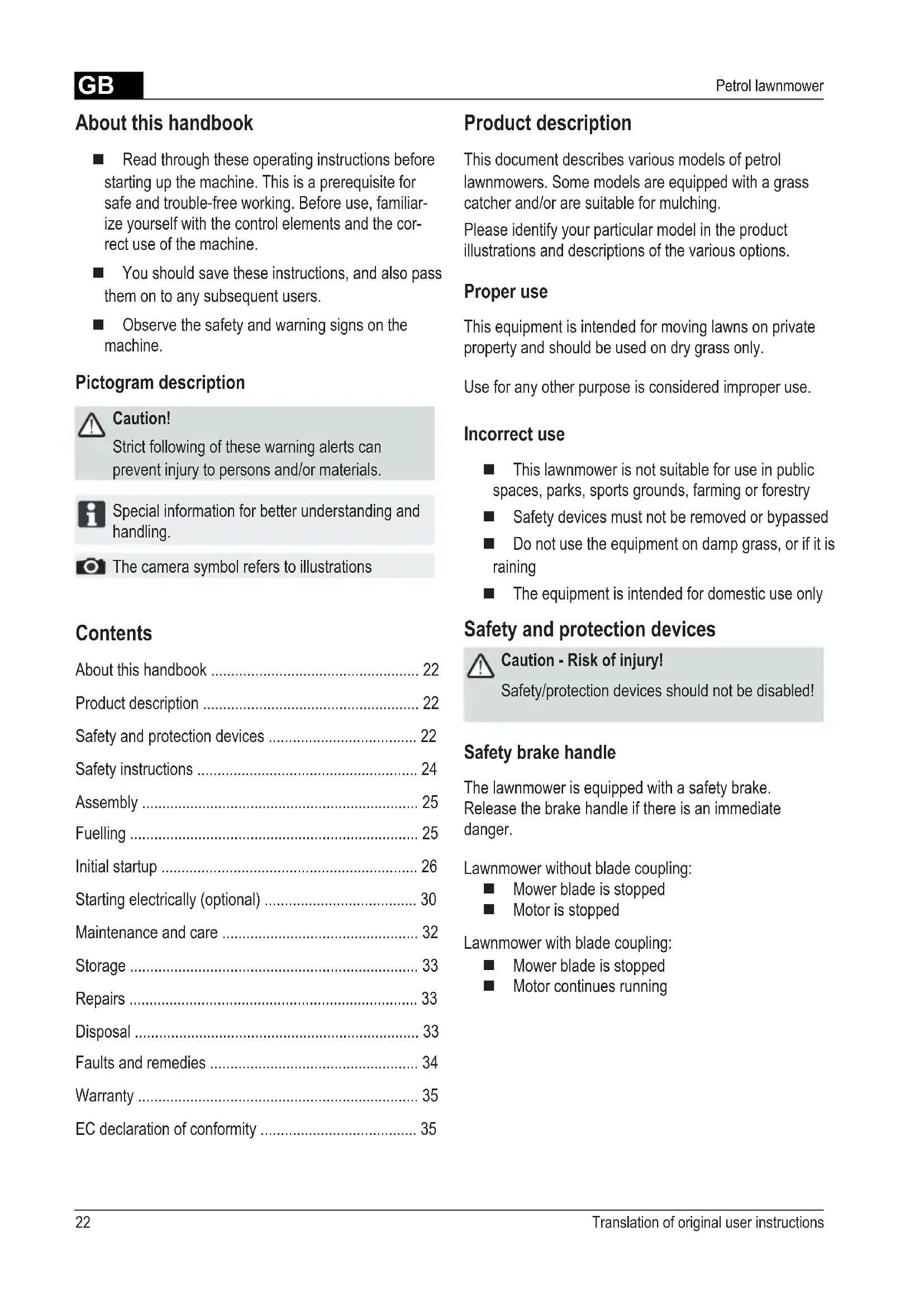 - EC declaration of conformity About this handbook Read through these operating instructions before starting up the machine. This is a prerequisite for safe and trouble-free working. Before use, familiar- ize yourself with the control elements and the cor- rect use of the machine. You should save these instructions, and also pass them on to any subsequent users. Observe the safety and warning signs on the machine. Pictogram description Caution! Strict following of these warning alerts can prevent injury to persons and/or materials. Special information for better understanding and handling. The camera symbol refers to illustrations Product description This document describes various models of petrol lawnmowers. Some models are equipped with a grass catcher and/or are suitable for mulching. Please identify your particular model in the product illustrations and descriptions of the various options. Proper use This equipment is intended for moving lawns on private property and should be used on dry grass only. Use for any other purpose is considered improper use. Incorrect use This lawnmower is not suitable for use in public spaces, parks, sports grounds, farming or forestry Safety devices must not be removed or bypassed Do not use the equipment on damp grass, or if it is raining The equipment is intended for domestic use only Safety and protection devices Caution - Risk of injury! Safety/protection devices should not be disabled! Safety brake handle The lawnmower is equipped with a safety brake. Release the brake handle if there is an immediate danger. Lawnmower without blade coupling: Mower blade is stopped Motor is stopped Lawnmower with blade coupling: Mower blade is stopped Motor continues runningGB 23470 591_c 1 Starter cable 9 Cutting height adjustment* 2 Start, stop* 10 Blade coupling* 3 Wheel drive* 11 Vario transmission* 4 Safety brake handle 12 Operating instructions 5 Ergonomic height adjustment* 13 Outlet shaft insert* 6 Fill level indicator* 14 Cover ap* 7 Deector plate* 15 Mulch kit* 8 Grass catcher* * depending on version Symbols on the device Caution! Be particularly careful when handling. Remove the spark plug connector before working on the cutting gear. Before initial startup read the instructions for use! Release the motor brake. Keep other people out of the danger area! Switch on the wheel drive. Keep hands and feet away from the cutting gear! p. 35