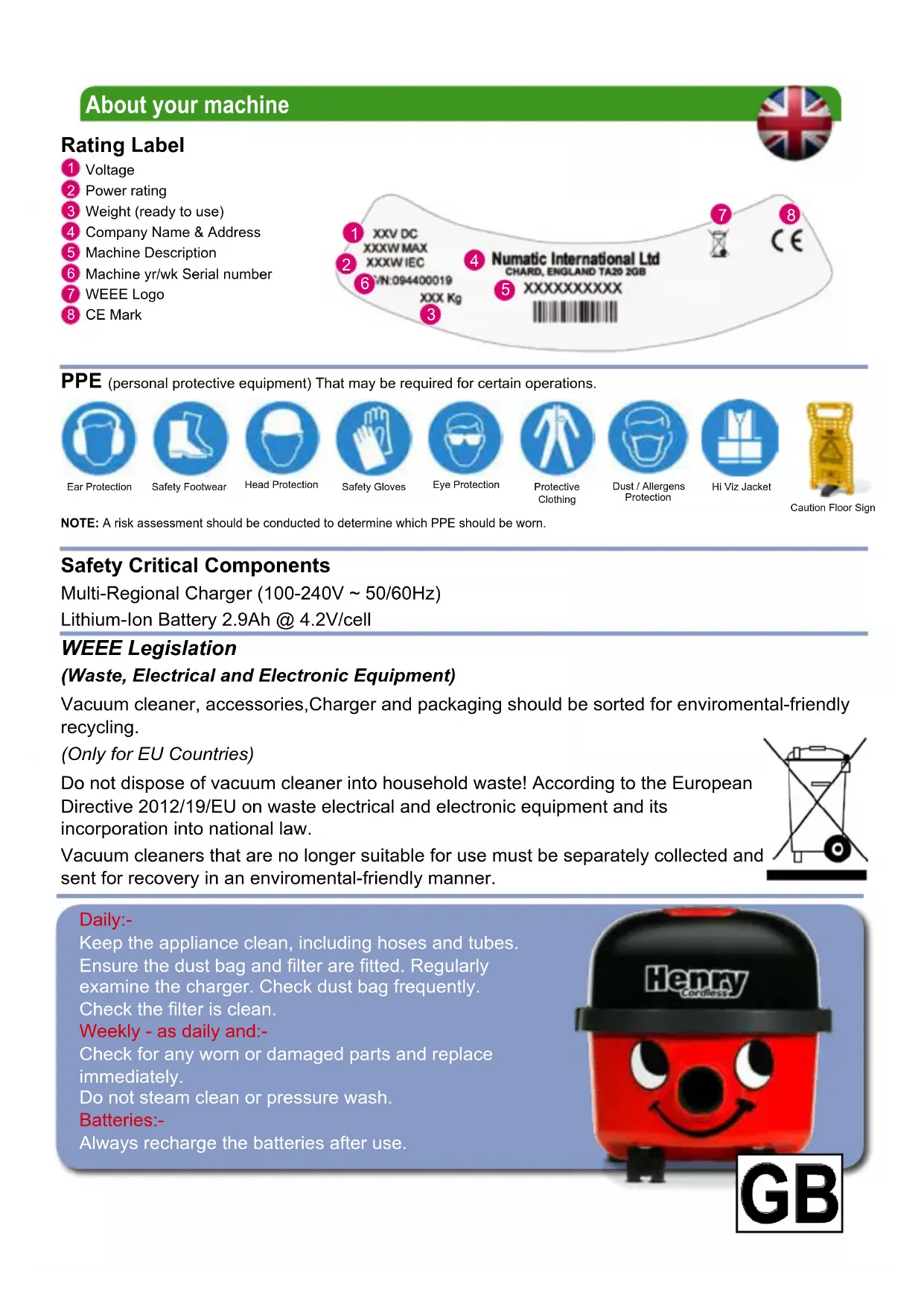 Rating Label VoltagePower ratingWeight (ready to use)Company Name & AddressMachine DescriptionMachine yr/wk Serial numberWEEE LogoCE MarkEar ProtectionSafety FootwearHead ProtectionSafety GlovesEye ProtectionProtective ClothingNOTE: A risk assessment should be conducted to determine which PPE should be worn.Dust / Allergens Protection Safety Critical Components Multi-Regional Charger (100-240V ~ 50/60Hz) Lithium-Ion Battery 2.9Ah @ 4.2V/cell Caution Floor SignHi Viz Jacket PPE (personal protective equipment) That may be required for certain operations. Daily:- Keep the appliance clean, including hoses and tubes. Ensure the dust bag and lter are tted. Regularly examine the charger. Check dust bag frequently. Check the lter is clean. Weekly - as daily and:- Check for any worn or damaged parts and replace immediately. Do not steam clean or pressure wash. Batteries:- Always recharge the batteries after use.
