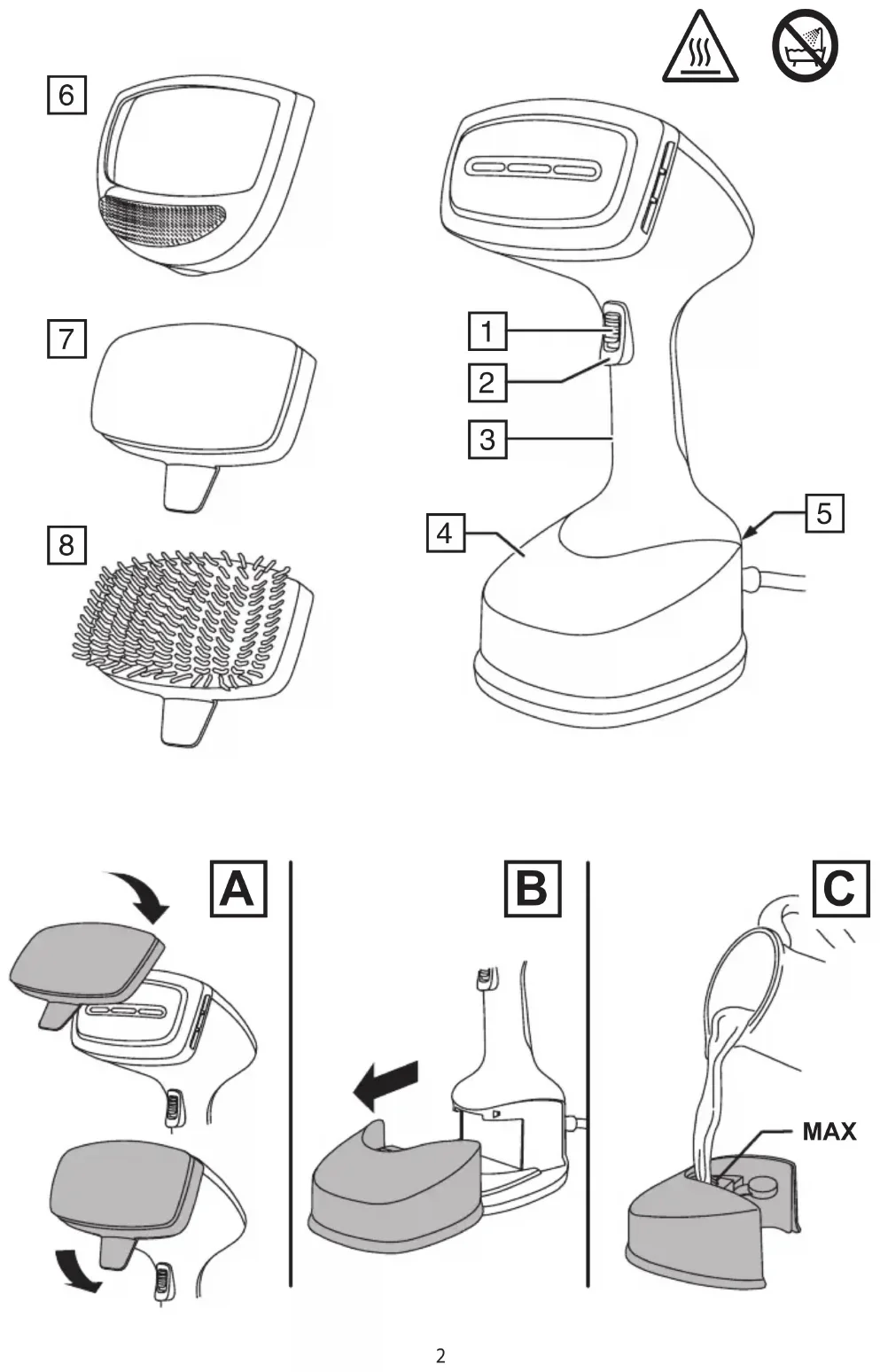 - Wearing clothes immediately after ironing or steaming can actually create wrinkles. Always allow the clothing to cool for about 5 minutes before wearing. ATTACHMENTS Your steamer has three attachments: Lint attachment Use on garments labelled k l that allow the use of steam. Tip: The pad on the attachment helps remove lint, hair, and animal fur. Delicate fabric attachment Use on garments labelled j that allow the use of steam. Tip: For items with printing/embellishment, turn the garment inside out to avoid damage to sensitive areas. Upholstery attachment Use to sanitise and refresh bedding, mattresses, curtains, plush toys, furniture, and hard surfaces (such as worktops or desks that are not heat sensitive). Always test for colourfastness and heat sensitivity on an inconspicuous area. Fitting/Removing (Fig. A)