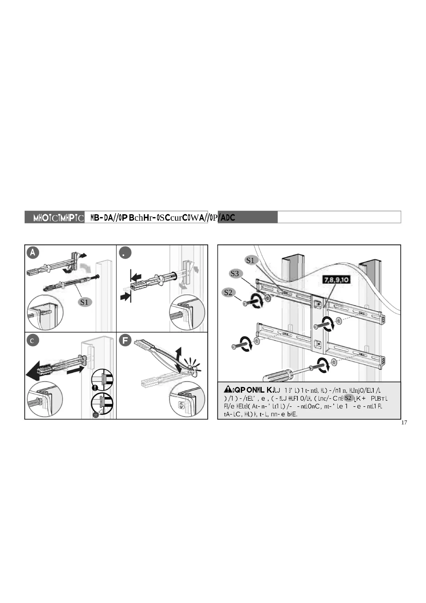 7/16 in. (11 mm) CAUTION: DO NOT overtighten. Tighten only until snug."Use your INSIDE tightening hands!"11 CAUTION: Avoid potential personal injuries and property damage! Studs must be at least 2x4 in. / 25 ga. If back side of wall is unfinished, drywall must be installed to a minimum of one stud left and right of the stud(s) being used to install the mount. Drywall must be a minimum of 1/2 in. (13 mm) thick on each side of the studs, and a minimum clearance of 1 ⅞ in. (48 mm) behind the wall is required. Stud type and structural strength must conform to the North American Specification for the Design of Cold-Formed Steel Structural Members [362 S 125 18, C-Shape, S - Stud Section]. Drywall must be secured to studs with screws 12 in. (304.8 mm) on center. Minimum horizontal space between fasteners: 16 in. (41 cm). Min. 8 in. (20 cm) Min. 8 in. (20 cm) Min. 16 in. (41 cm ) Max. 5/8 in. (16 mm) Min. 1/2 in. (13 mm) CAUTION: Avoid potential personal injuries and property damage! Drywall covering the wall must not exceed 5/8 in. (16 mm). Minimum horizontal space between fasteners: 16 in. (41 cm). Minimum wood stud size: nominal 2 x 4 in. (51 x 102 mm) actual 1 ½ x 3 ½ in. (38 x 89 mm). CAUTION: Avoid potential personal injuries and property damage! Mount wall plate directly onto the concrete surface (no surface covering). Minimum horizontal space between fasteners: 16 in. (41 cm). Min. Stud Spacing: 16 in. (41 cm ) Min. Stud Spacing: 16 in. (41 cm ) Min. Stud Width:nominal 2 in. (51 mm)actual 1 ½ in. (38 mm) Min. Stud Width:nominal 2 in. (51 mm) Min. Stud Depth:nominal 4 in. (102 mm)actual 3 ½ in. (89 mm) Min. Stud Depth:nominal 4 in. (102 mm) For WOOD STUD INSTALLATIONS For CONCRETE INSTALLATIONS For STEEL STUD INSTALLATIONS follow STEP 2.2 A on PAGE 12 follow STEP 2.2 B on PAGE 14 follow STEP 2.2 C on PAGE 16