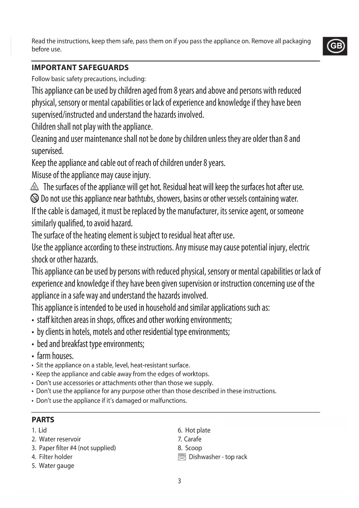 Read the instructions, keep them safe, pass them on if you pass the appliance on. Remove all packaging before use. IMPORTANT SAFEGUARDS Follow basic safety precautions, including: This appliance can be used by children aged from 8 years and above and persons with reduced physical, sensory or mental capabilities or lack of experience and knowledge if they have been supervised/instructed and understand the hazards involved. Children shall not play with the appliance. Cleaning and user maintenance shall not be done by children unless they are older than 8 and supervised. Keep the appliance and cable out of reach of children under 8 years. Misuse of the appliance may cause injury. h The surfaces of the appliance will get hot. Residual heat will keep the surfaces hot after use. b Do not use this appliance near bathtubs, showers, basins or other vessels containing water. If the cable is damaged, it must be replaced by the manufacturer, its service agent, or someone similarly qualied, to avoid hazard. The surface of the heating element is subject to residual heat after use. Use the appliance according to these instructions. Any misuse may cause potential injury, electric shock or other hazards. This appliance can be used by persons with reduced physical, sensory or mental capabilities or lack of experience and knowledge if they have been given supervision or instruction concerning use of the appliance in a safe way and understand the hazards involved. This appliance is intended to be used in household and similar applications such as: