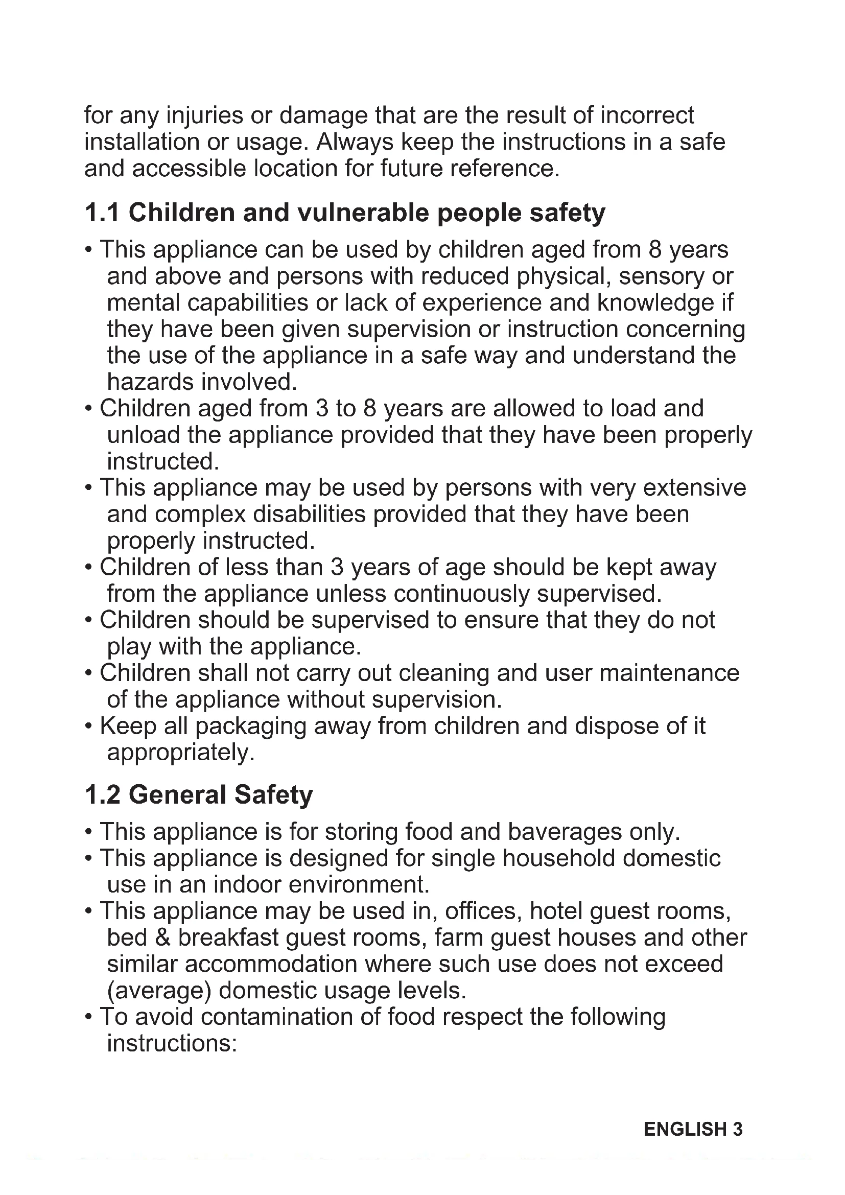 Before the installation and use of the appliance, carefully read the supplied instructions. The manufacturer is not responsible 2 ENGLISHfor any injuries or damage that are the result of incorrect installation or usage. Always keep the instructions in a safe and accessible location for future reference.