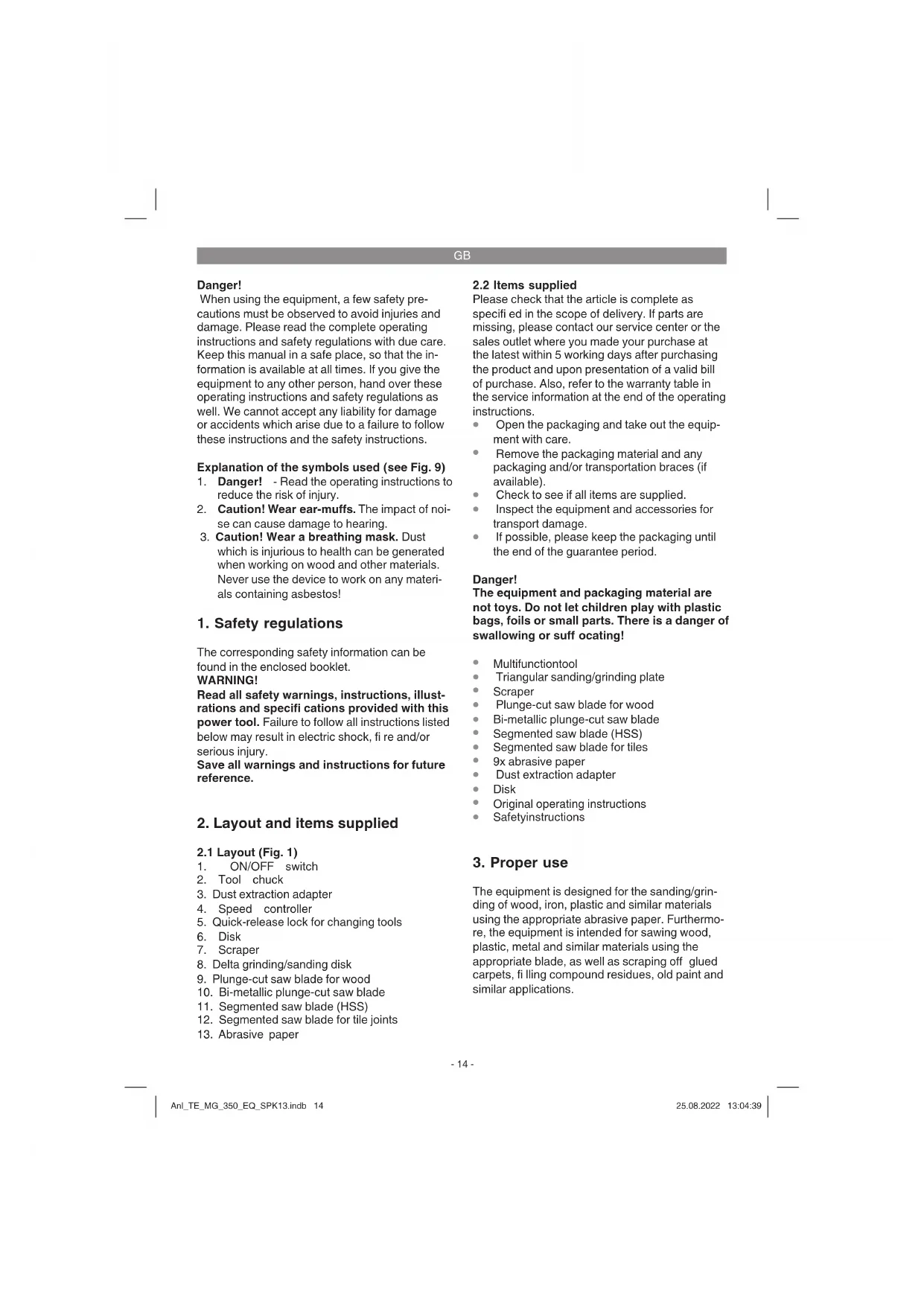 The equipment is designed for the sanding/grin- ding of wood, iron, plastic and similar materials using the appropriate abrasive paper. Furthermo- re, the equipment is intended for sawing wood, plastic, metal and similar materials using the appropriate blade, as well as scraping off glued carpets, fi lling compound residues, old paint and similar applications. Anl_TE_MG_350_EQ_SPK13.indb 14Anl_TE_MG_350_EQ_SPK13.indb 14 25.08.2022 13:04:3925.08.2022 13:04:39GB