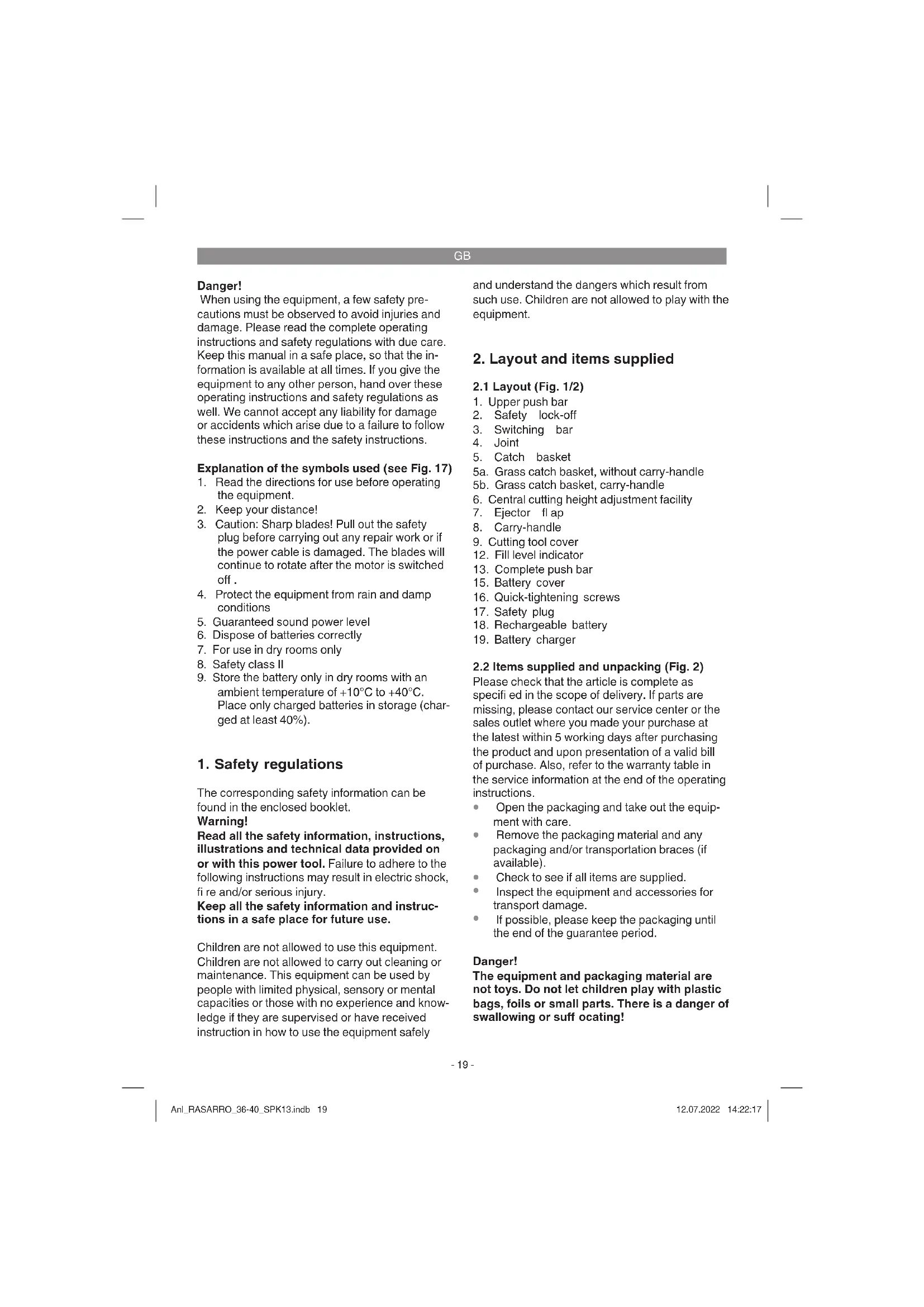 If possible, please keep the packaging until the end of the guarantee period. Danger! The equipment and packaging material are not toys. Do not let children play with plastic bags, foils or small parts. There is a danger of swallowing or suff ocating! Anl_RASARRO_36-40_SPK13.indb 19Anl_RASARRO_36-40_SPK13.indb 19 12.07.2022 14:22:1712.07.2022 14:22:17GB