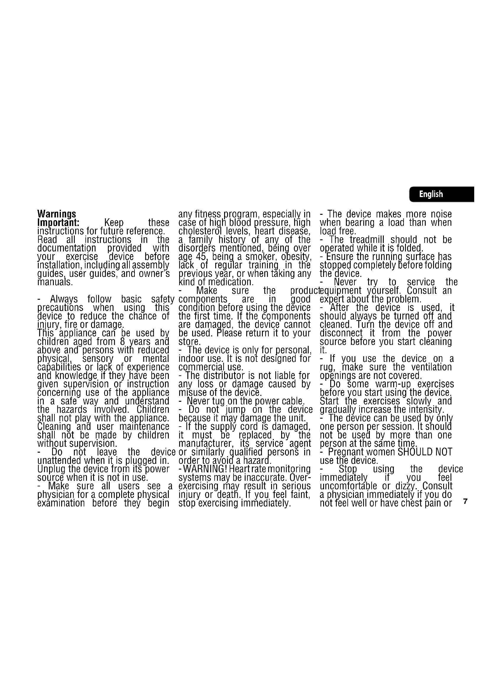 English Warnings Important: Keep these instructions for future reference. Read all instructions in the documentation provided with your exercise device before installation, including all assembly guides, user guides, and owner’s manuals. - Always follow basic safety precautions when using this device to reduce the chance of injury, fire or damage. This appliance can be used by children aged from 8 years and above and persons with reduced physical, sensory or mental capabilities or lack of experience and knowledge if they have been given supervision or instruction concerning use of the appliance in a safe way and understand the hazards involved. Children shall not play with the appliance. Cleaning and user maintenance shall not be made by children without supervision. - Do not leave the device unattended when it is plugged in. Unplug the device from its power source when it is not in use. - Make sure all users see a physician for a complete physical examination before they begin any fitness program, especially in case of high blood pressure, high cholesterol levels, heart disease, a family history of any of the disorders mentioned, being over age 45, being a smoker, obesity, lack of regular training in the previous year, or when taking any kind of medication. - Make sure the product components are in good condition before using the device the first time. If the components are damaged, the device cannot be used. Please return it to your store. - The device is only for personal, indoor use. It is not designed for commercial use. - The distributor is not liable for any loss or damage caused by misuse of the device. - Never tug on the power cable. - Do not jump on the device because it may damage the unit. - If the supply cord is damaged, it must be replaced by the manufacturer, its service agent or similarly qualified persons in order to avoid a hazard. - WARNING! Heart rate monitoring systems may be inaccurate. Over- exercising may result in serious injury or death. If you feel faint, stop exercising immediately. - The device makes more noise when bearing a load than when load free. - The treadmill should not be operated while it is folded. - Ensure the running surface has stopped completely before folding the device. - Never try to service the equipment yourself. Consult an expert about the problem. - After the device is used, it should always be turned off and cleaned. Turn the device off and disconnect it from the power source before you start cleaning it. - If you use the device on a rug, make sure the ventilation openings are not covered. - Do some warm-up exercises before you start using the device. Start the exercises slowly and gradually increase the intensity. - The device can be used by only one person per session. It should not be used by more than one person at the same time. - Pregnant women SHOULD NOT use the device. - Stop using the device immediately if you feel uncomfortable or dizzy. Consult a physician immediately if you do not feel well or have chest pain or8 1m = 3,28 feet any other symptoms. - If you have not done exercise for a long time or if you have a heart condition, a circulatory disorder or an orthopaedic problem, consult a physician before using the device. - This device is not designed for use by children or persons with reduced mental or physical capabilities unless they are supervised or instructed by someone responsible for their safety. - Children should be supervised at all times to ensure they do not play with the device. - Do not use the device if you weigh more than 110 kg. - This device is designed for individual use. Any breakdown caused by improper use is not covered by the warranty. - Make sure the device is on a flat surface. Do not use dangling clothing on the treadmill and do not scuff the treadmill, as this will make it difficult to use. Wear sport shoes when using the treadmill. Do not start the treadmill while standing on it. The best position when turning on the device is to stand with one foot on either side of the treadmill. If the initial speed of the treadmill is too fast, do not jump on the treadmill. Start using it at a lower speed and increase it gradually. - Do not suddenly stop walking or running on the treadmill. Press the ON/OFF button and the treadmill will gradually stop. - Stop walking when the treadmill stops. - Leave a safety area of 2 metres by 1 metre behind the treadmill. PRECAUTION: DO NOT remove the cover of the control panel, as this may cause an electric shock. The parts inside cannot be repaired by the user. Product description