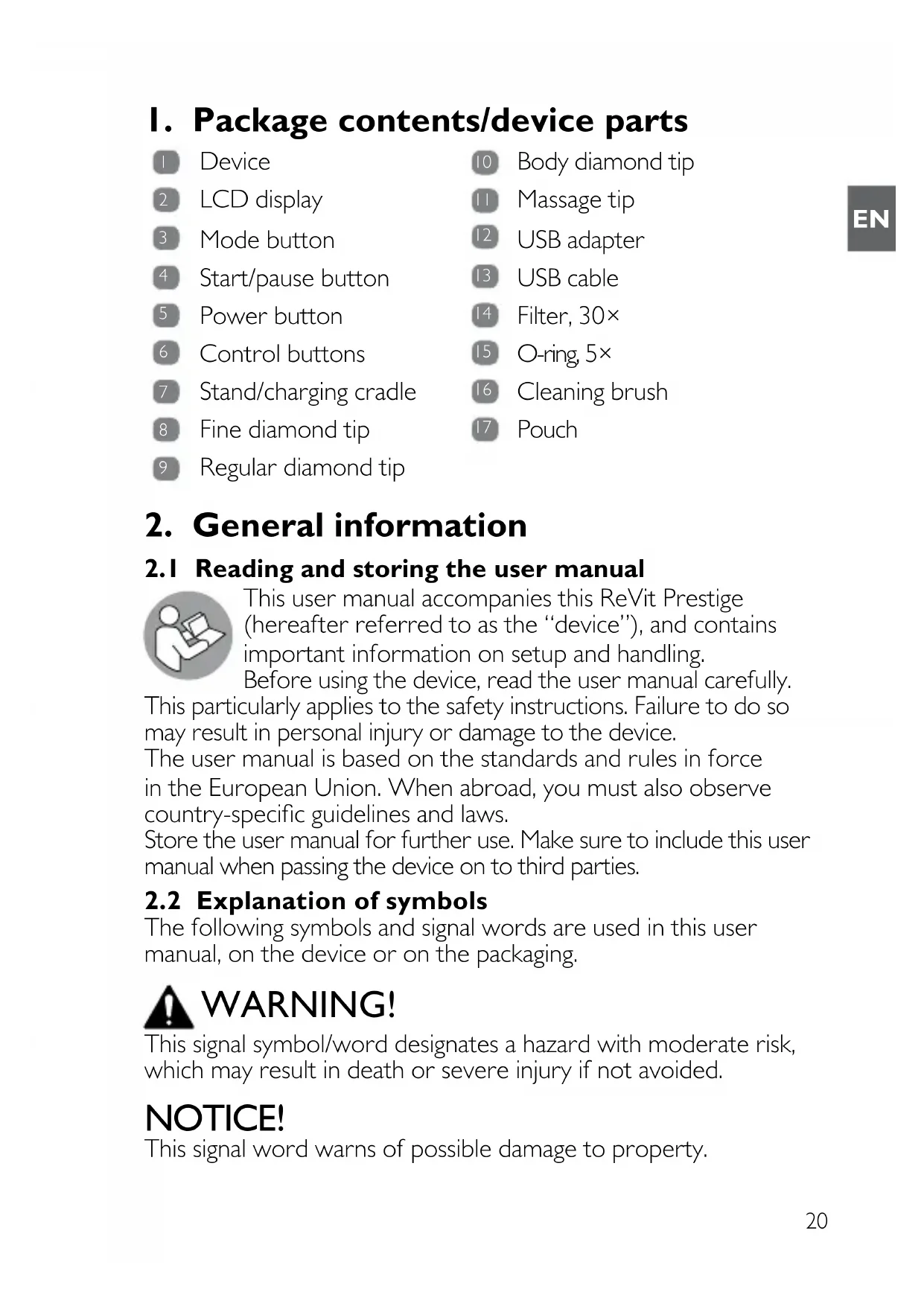 This user manual accompanies this ReVit Prestige (hereafter referred to as the “device”), and contains important information on setup and handling. Before using the device, read the user manual carefully. This particularly applies to the safety instructions. Failure to do so may result in personal injury or damage to the device. The user manual is based on the standards and rules in force in the European Union. When abroad, you must also observe country-specific guidelines and laws. Store the user manual for further use. Make sure to include this user manual when passing the device on to third parties.