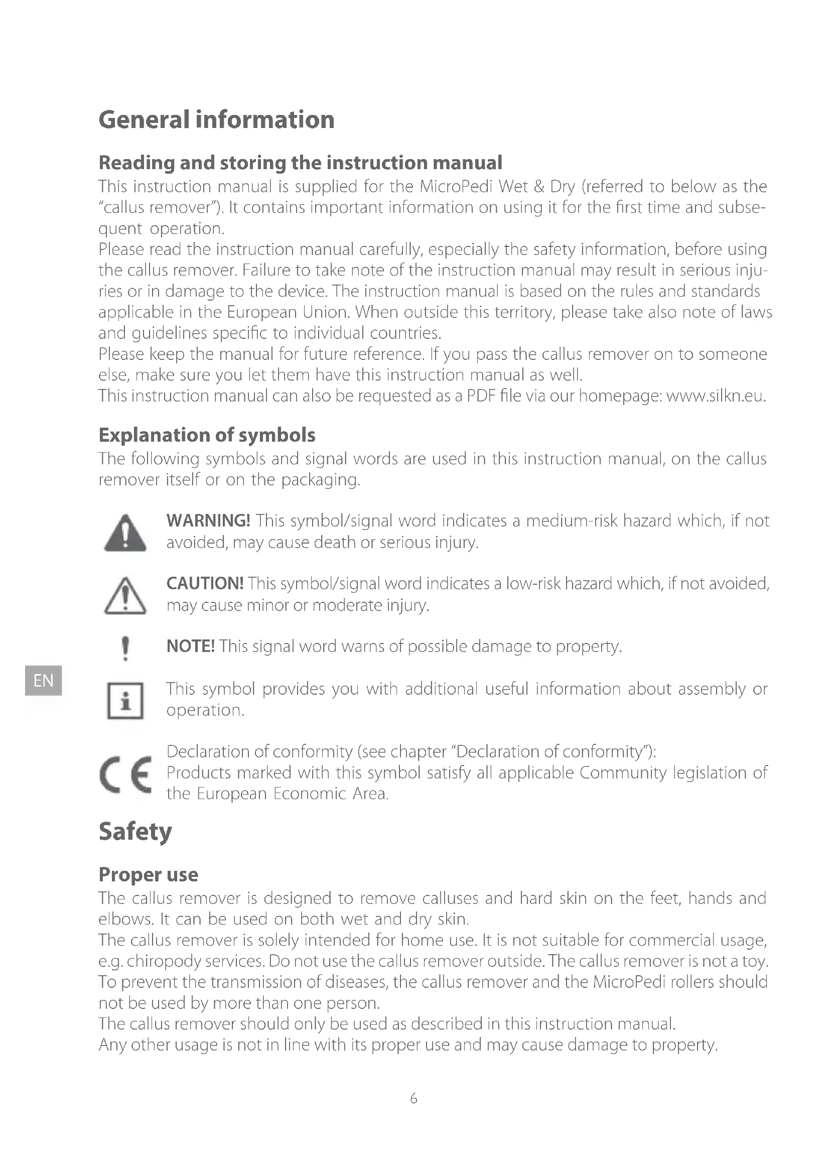 General information Reading and storing the instruction manual This instruction manual is supplied for the MicroPedi Wet & Dry (referred to below as the “callus remover”). It contains important information on using it for the rst time and subse- quent operation. Please read the instruction manual carefully, especially the safety information, before using the callus remover. Failure to take note of the instruction manual may result in serious inju- ries or in damage to the device. The instruction manual is based on the rules and standards applicable in the European Union. When outside this territory, please take also note of laws and guidelines specic to individual countries. Please keep the manual for future reference. If you pass the callus remover on to someone else, make sure you let them have this instruction manual as well. This instruction manual can also be requested as a PDF le via our homepage: www.silkn.eu. Explanation of symbols The following symbols and signal words are used in this instruction manual, on the callus remover itself or on the packaging. WARNING! This symbol/signal word indicates a medium-risk hazard which, if not avoided, may cause death or serious injury. CAUTION! This symbol/signal word indicates a low-risk hazard which, if not avoided, may cause minor or moderate injury. NOTE! This signal word warns of possible damage to property. This symbol provides you with additional useful information about assembly or operation. Declaration of conformity (see chapter “Declaration of conformity”): Products marked with this symbol satisfy all applicable Community legislation of the European Economic Area. Safety Proper use The callus remover is designed to remove calluses and hard skin on the feet, hands and elbows. It can be used on both wet and dry skin. The callus remover is solely intended for home use. It is not suitable for commercial usage, e.g. chiropody services. Do not use the callus remover outside. The callus remover is not a toy. To prevent the transmission of diseases, the callus remover and the MicroPedi rollers should not be used by more than one person. The callus remover should only be used as described in this instruction manual. Any other usage is not in line with its proper use and may cause damage to property.7