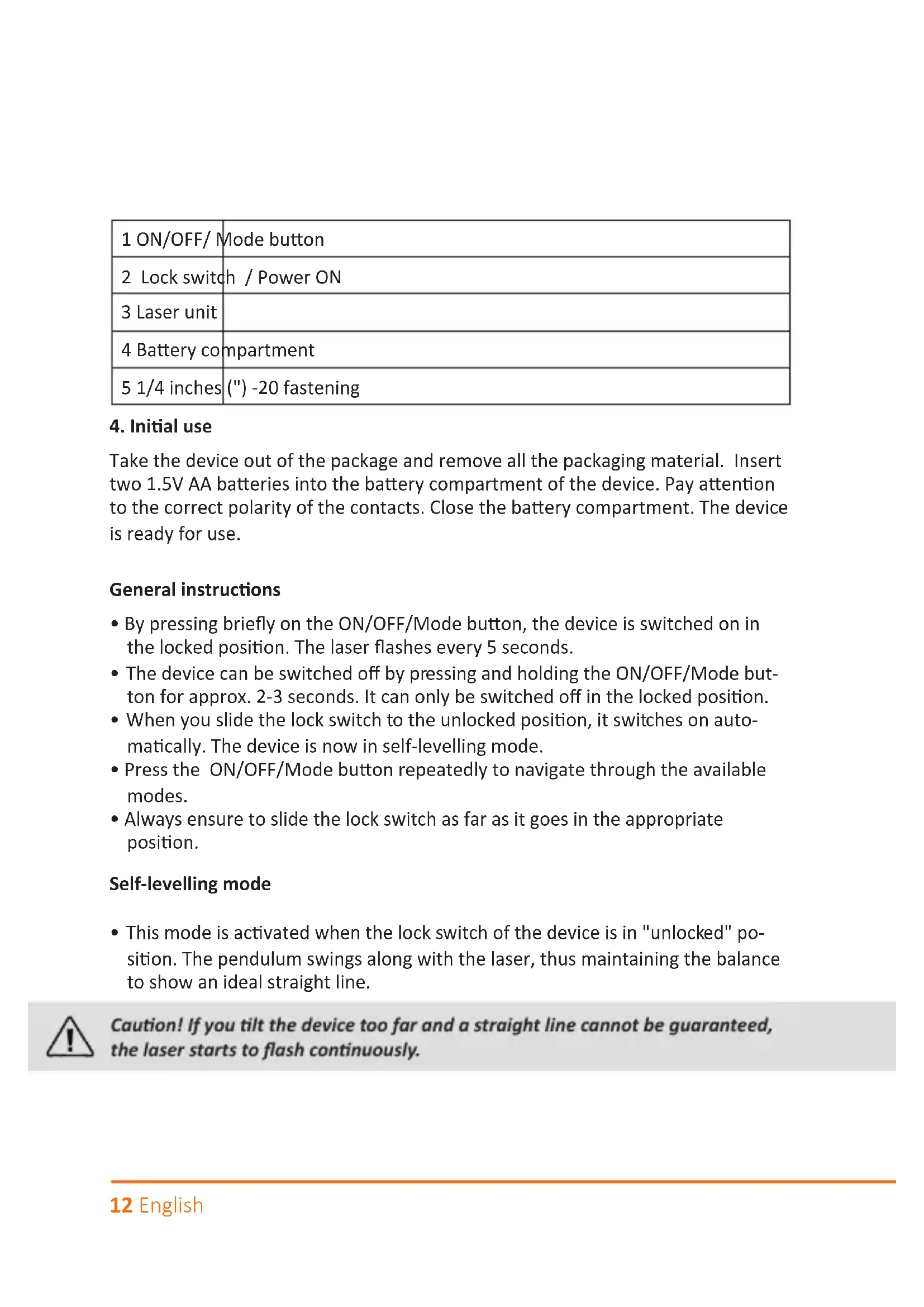 - This mode is acvated when the lock switch of the device is in "unlocked" po- sion. The pendulum swings along with the laser, thus maintaining the balance to show an ideal straight line. Cauon! If you lt the device too far and a straight line cannot be guaranteed, the laser starts to ash connuously. 1 ON/OFF/ Mode buon 2 Lock switch / Power ON 3 Laser unit 4 Baery compartment 5 1/4 inches (") -20 fastening13English Manual mode