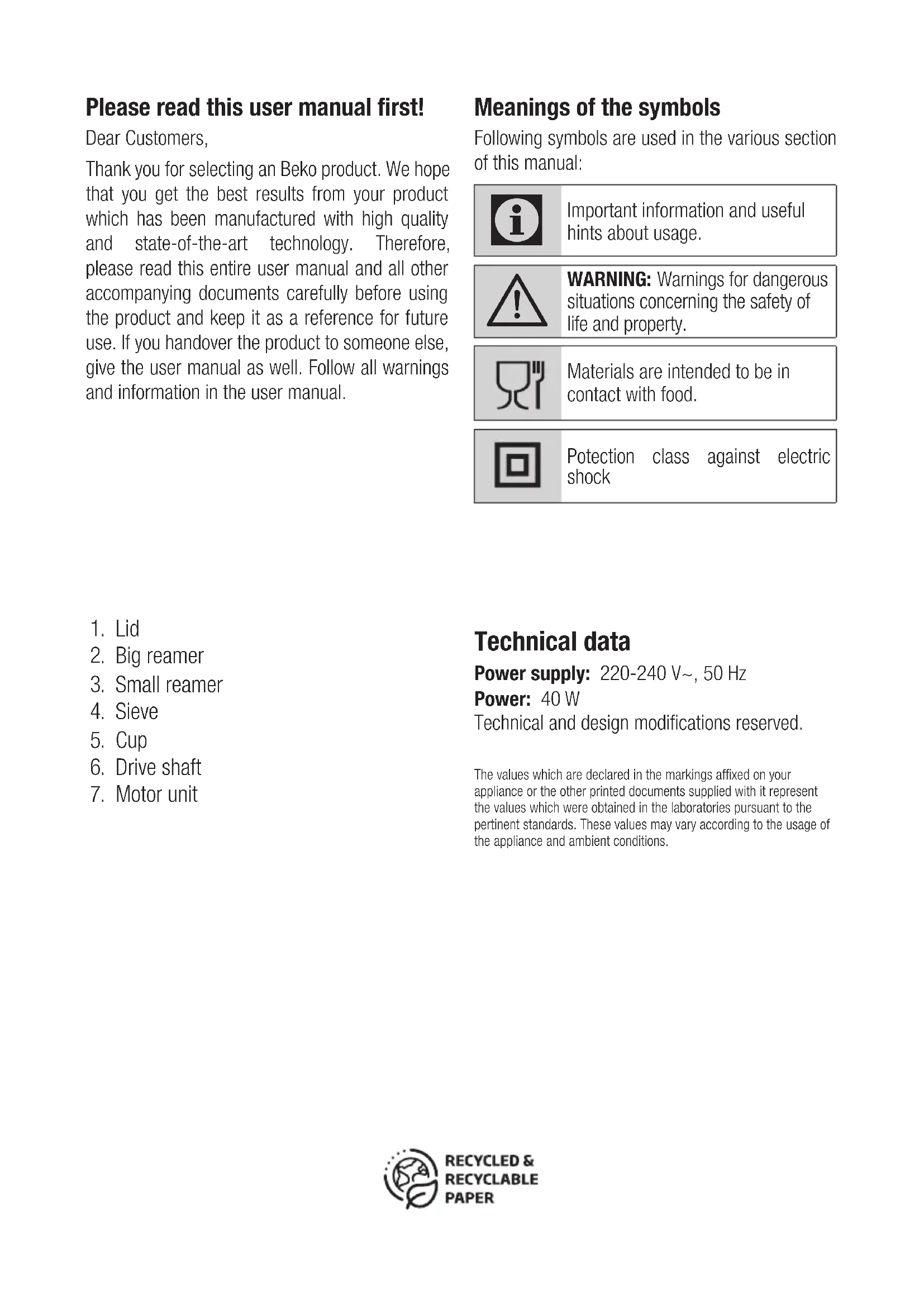 Please read this user manual first! Dear Customers,Thank you for selecting an Beko product. We hope that you get the best results from your product which has been manufactured with high quality and state-of-the-art technology. Therefore, please read this entire user manual and all other accompanying documents carefully before using the product and keep it as a reference for future use. If you handover the product to someone else, give the user manual as well. Follow all warnings and information in the user manual. Meanings of the symbols Following symbols are used in the various section of this manual: Important information and useful hints about usage. WARNING: Warnings for dangerous situations concerning the safety of life and property.Materials are intended to be in contact with food.Potection class against electric shock