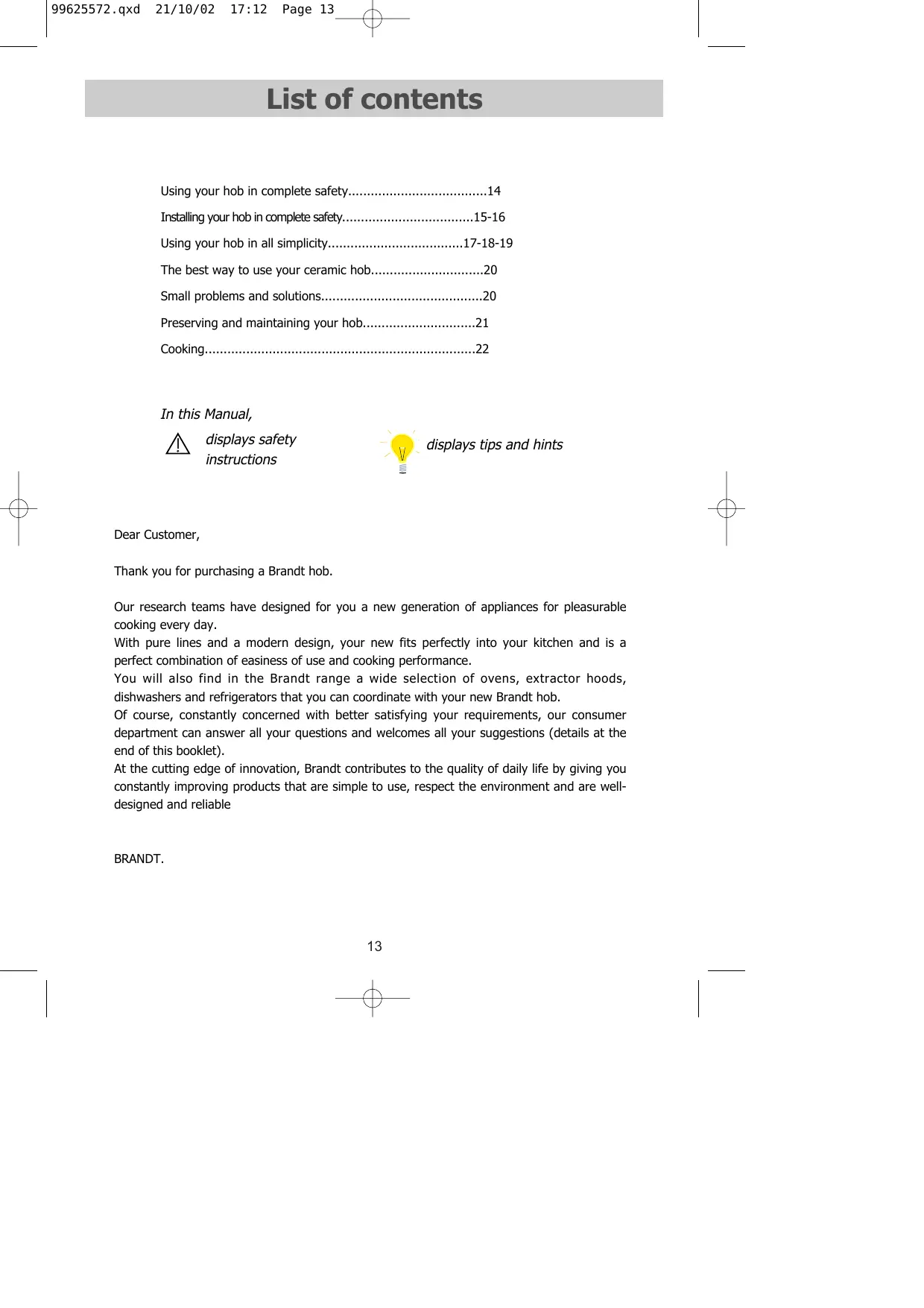 - 99625572.qxd 21/10/02 17:12 Page 13 List of contents Using your hob in complete safety p. 14