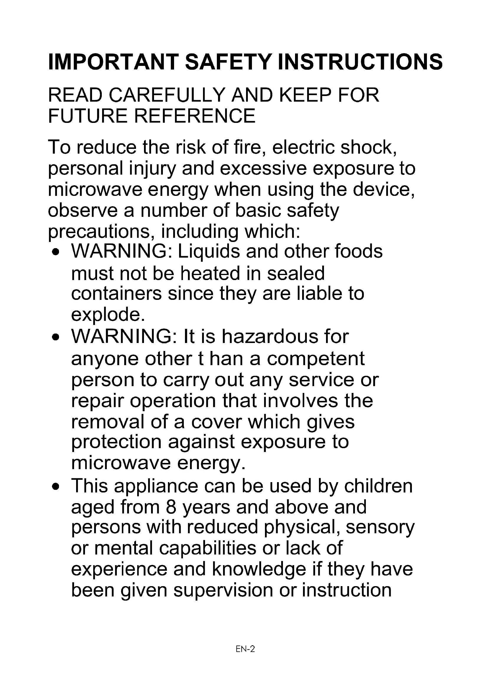 This appliance is not intended for use by persons (including children) with reduced physical, sensory or mental capabilities, or lack of experience and knowledge, unless they have been given supervision or instruction concerning use of the appliance by a person responsible for their safety.EN-9
