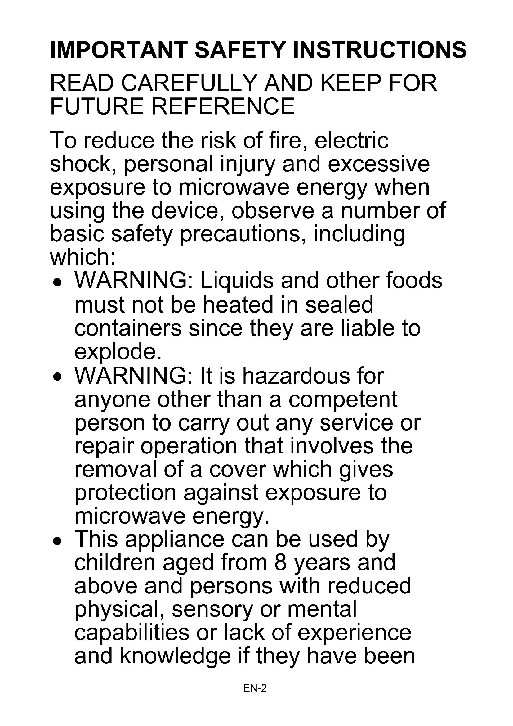 FUTURE REFERENCE To reduce the risk of fire, electric shock, personal injury and excessive exposure to microwave energy when using the device, observe a number of basic safety precautions, including which: