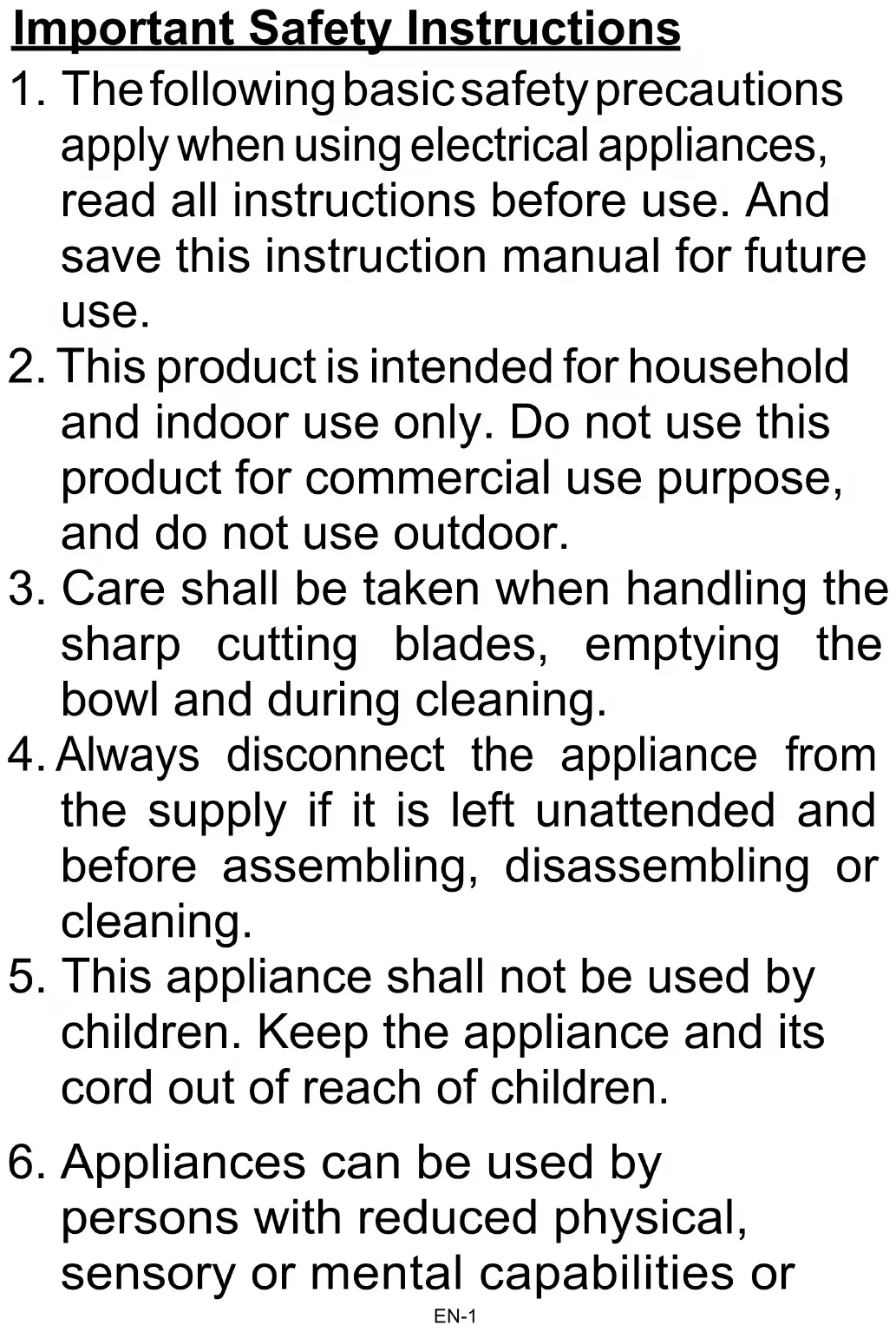 sharp, please paid attention for handing the sharp cutting blades during cleaning, emptying the bowl and user maintenance.