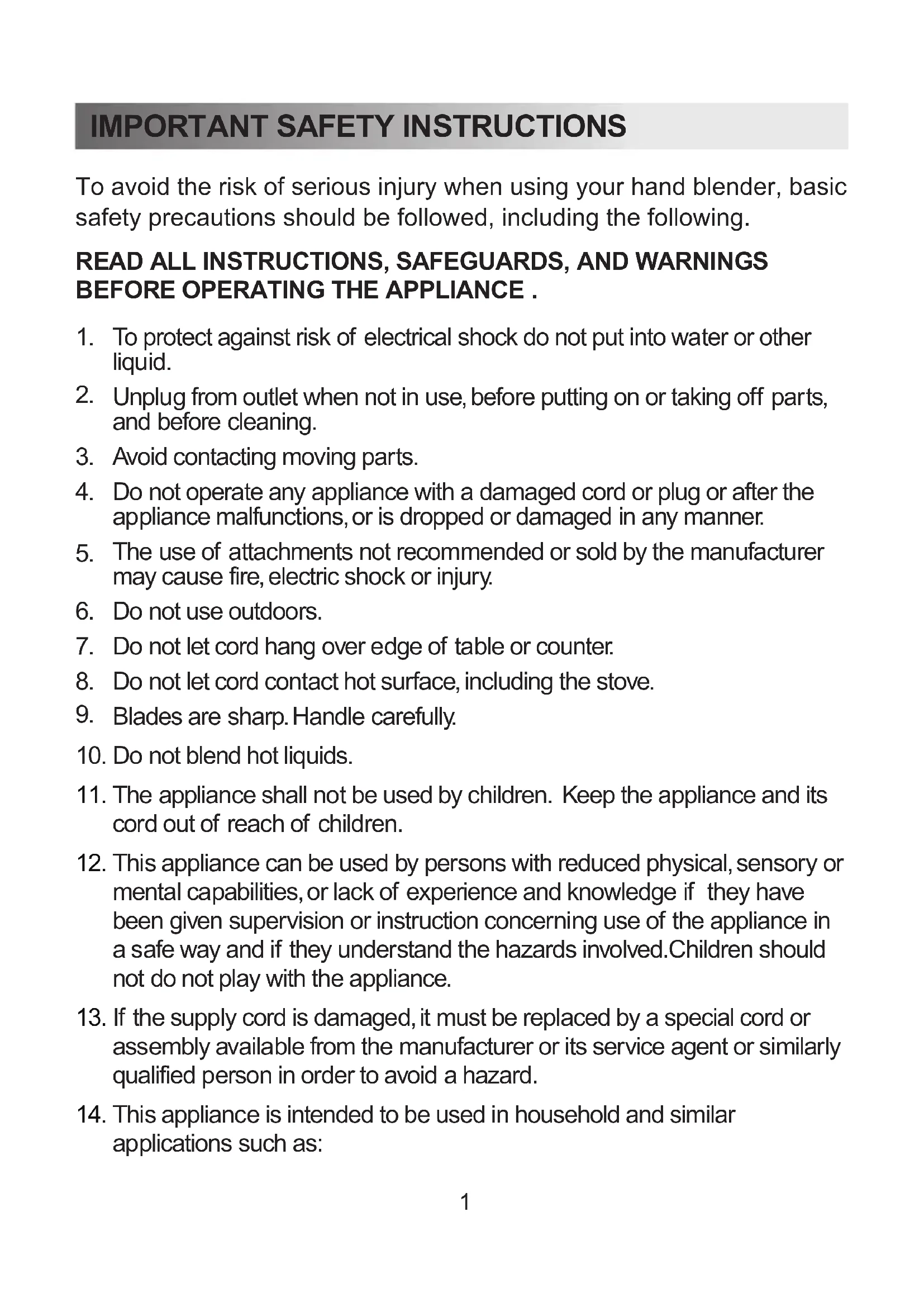To protect against risk of electrical shock do not put into water or other liquid. Unplug from outlet when not in use, before putting on or taking off parts, and before cleaning. Avoid contacting moving parts. Do not operate any appliance with a damaged cord or plug or after the appliance malfunctions, or is dropped or damaged in any manner. The use of attachments not recommended or sold by the manufacturer may cause fire, electric shock or injury. Do not use outdoors. Do not let cord hang over edge of table or counter. Do not let cord contact hot surface, including the stove. Blades are sharp. Handle carefully. Do not blend hot liquids. The appliance shall not be used by children. Keep the appliance and its cord out of reach of children. This appliance can be used by persons with reduced physical, sensory or mental capabilities, or lack of experience and knowledge if they have been given supervision or instruction concerning use of the appliance in a safe way and if they understand the hazards involved.Children should not do not play with the appliance. If the supply cord is damaged, it must be replaced by a special cord or assembly available from the manufacturer or its service agent or similarly qualified person in order to avoid a hazard. This appliance is intended to be used in household and similar applications such as:2