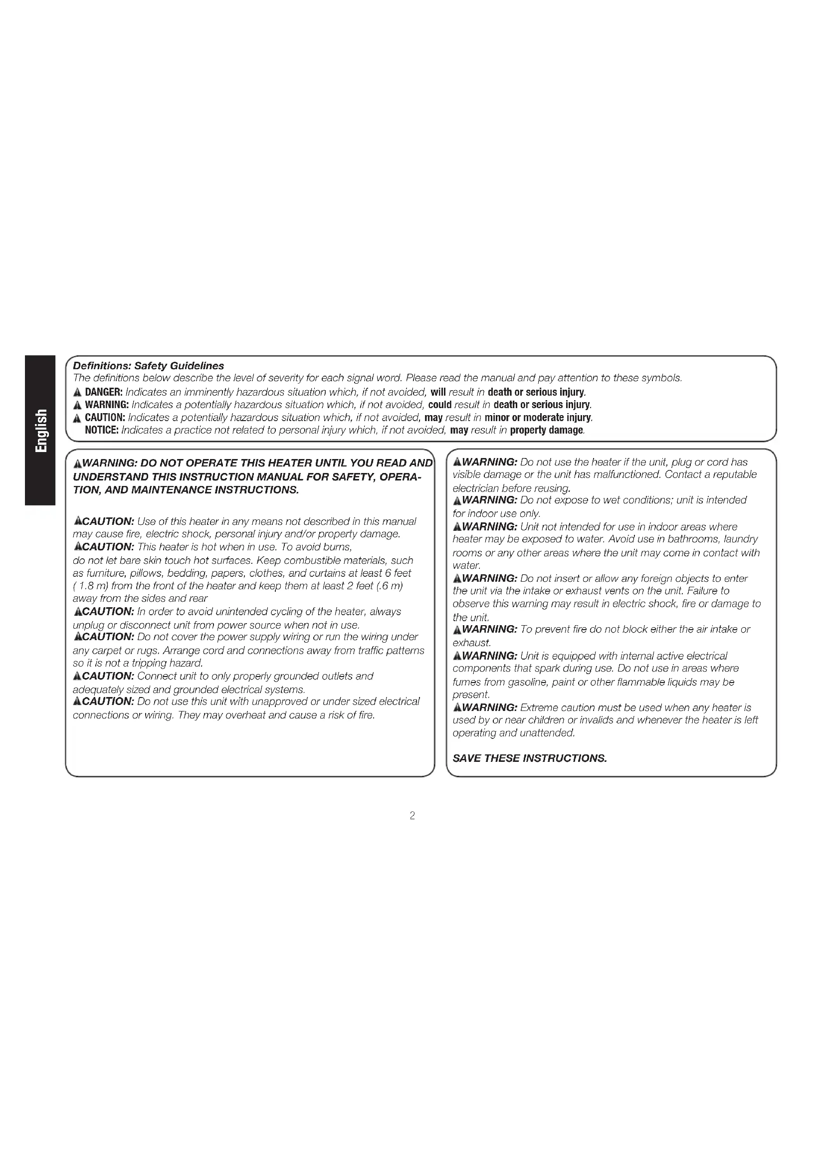 - UNDERSTAND THIS INSTRUCTION MANUAL FOR SAFETY, OPERA- TION, AND MAINTENANCE INSTRUCTIONS. CAUTION: Use of this heater in any means not described in this manual may cause fire, electric shock, personal injury and/or property damage. CAUTION: This heater is hot when in use. To avoid burns, do not let bare skin touch hot surfaces. Keep combustible materials, such as furniture, pillows, bedding, papers, clothes, and curtains at least 6 feet ( 1.8 m) from the front of the heater and keep them at least 2 feet (.6 m) away from the sides and rear CAUTION: In order to avoid unintended cycling of the heater, always unplug or disconnect unit from power source when not in use. CAUTION: Do not cover the power supply wiring or run the wiring under any carpet or rugs. Arrange cord and connections away from traffic patterns so it is not a tripping hazard. CAUTION: Connect unit to only properly grounded outlets and adequately sized and grounded electrical systems. CAUTION: Do not use this unit with unapproved or under sized electrical connections or wiring. They may overheat and cause a risk of fire.3 English CONTENTS WARNINGS p. 2