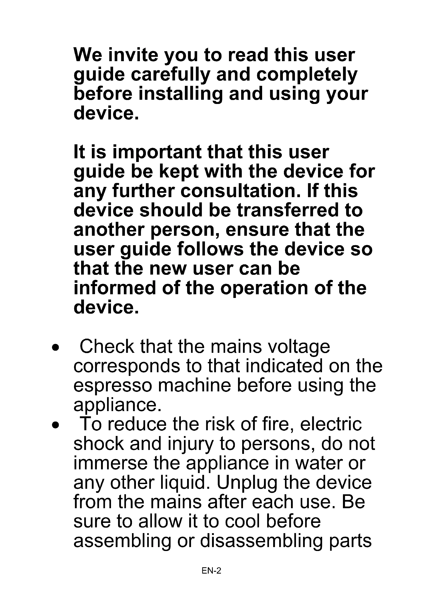 - Check that the mains voltage corresponds to that indicated on the espresso machine before using the appliance.