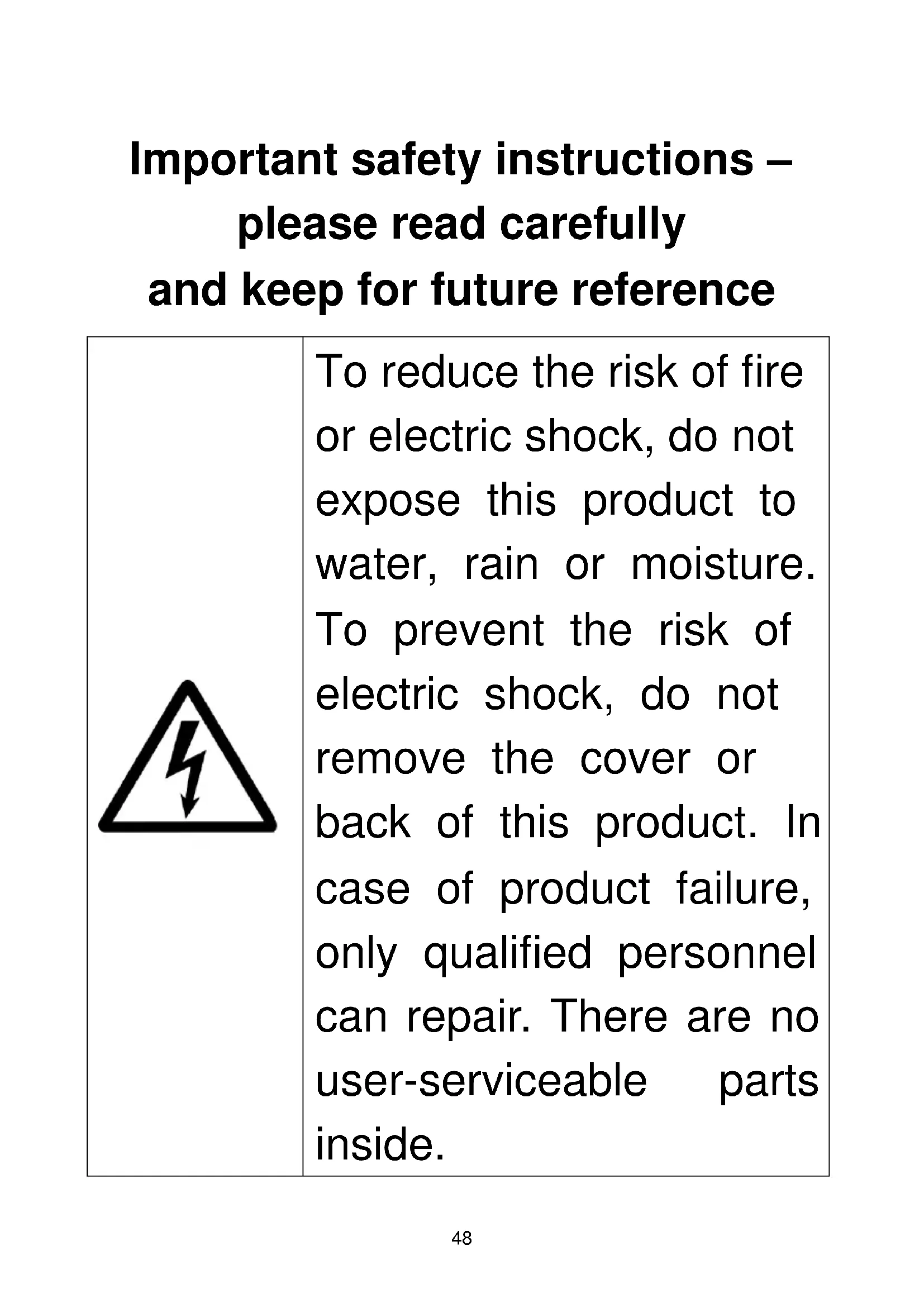 Press ◄/► / button to highlight your preferred submenu: Photo, Music, Movie and Text, press OK button to confirm. Remote operations when playing multimedia files: - Press button on remote control to start or pause the playback. - Press button on remote control to stop playing. - Press button on remote control to move fast backward. - Press button on remote control to move fast forward. - Press button on remote control to play previous file. - Press button on remote control to play next file.81 Troubleshooting No image and voice Possible causes: ● Power cord, antenna or input devices are not connected; ● The TV set is not powered on. Solutions: ● Check Power cord, antenna and input devices; ● Press Power key on the remote control; ● Press Power key on the set to power it off for 5 seconds and then re-power it on. No voice Possible causes: ● The volume is too low; Muted or cancelled; ● Incorrect sound system. Solutions: ● Press Volume key to turn up the volume; ● Press Mute key to cancel Mute mode. ● Well connect connection to the background sound; ● Change the sound system in the menu. Snows and noises Possible causes: ● The cable is damaged or gets loose; ● Incorrect channel preset; ● Improper antenna positioning. Solutions: ● Check whether the connection of the antenna cable, DVD and the cables is correct; ● Reset channels or fine tune the channel; ● Adjust the direction of the antenna.82 Achromatic colour Possible causes: ● Incorrect Colour system settings; Low chroma level setting; ● Improper antenna positioning. Solutions: ● Change the colour system into the local system in the menu; ● Increase chroma level; ● Adjust the direction of the antenna. Remote control has no response Possible causes: ● Battery runs up; ● Incorrect battery loading; Solutions: ● Check the battery electricity or replace the battery; ● Check if the poles of the battery are correct. Note: To properly watch CANAL+ using this product, carry out DVB-T channel search when CANAL+ is unscrambled, from 12:30 p.m. to 1:30 p.m. and from 7:00 p.m. to 8:30 p.m. Important Notice The display of this television is made up of a large number of colour Although it has at least 99.999% of effective pixels, some black dots or bright spots (red, green or blue) may appear constantly on the screen. This is a characteristic of the screen (according to industrial standards), and is not a defect. Sometimes, the screen may include an unlit pixel, which will be seen as a blue, red, green or black dot. This does not affect the functioning of the product and should be considered normal.83 Cleaning Instruction ● Before cleaning this product, press STANDBY button to turn it to the standby mode and wait for a few minutes to disconnect the power plug. ● Wipe this product with a dry, soft cloth. Do not spray water directly onto the TV, but apply a small amount of water on the corner of the cloth and wipe as gently as possible. Never use cleaning fluids, wax, or chemicals. ● Never use alcohol, benzene, thinner, cleaning fluid or other chemicals. And do not use compressed air to remove dust. ● If the surface is extremely dirty, wipe it with a cloth which has been dipped in a weak soap-water solution and wrung out thoroughly, and then wipe again with a dry cloth. ●Before you plug in the TV back, let the screen dry completely.84 Note on Defective Pixels Your product has been manufactured with great care. Nevertheless, it is possible that some pixels remain constantly on or unlit. Please refer to the table below about the tolerance level for defective pixels on this product. Screen Size Resolution No. of Bright or Dark Sub-Pixels (Color Pixels) No. of Bright or Dark Pixels (White or Black) Continuous Line