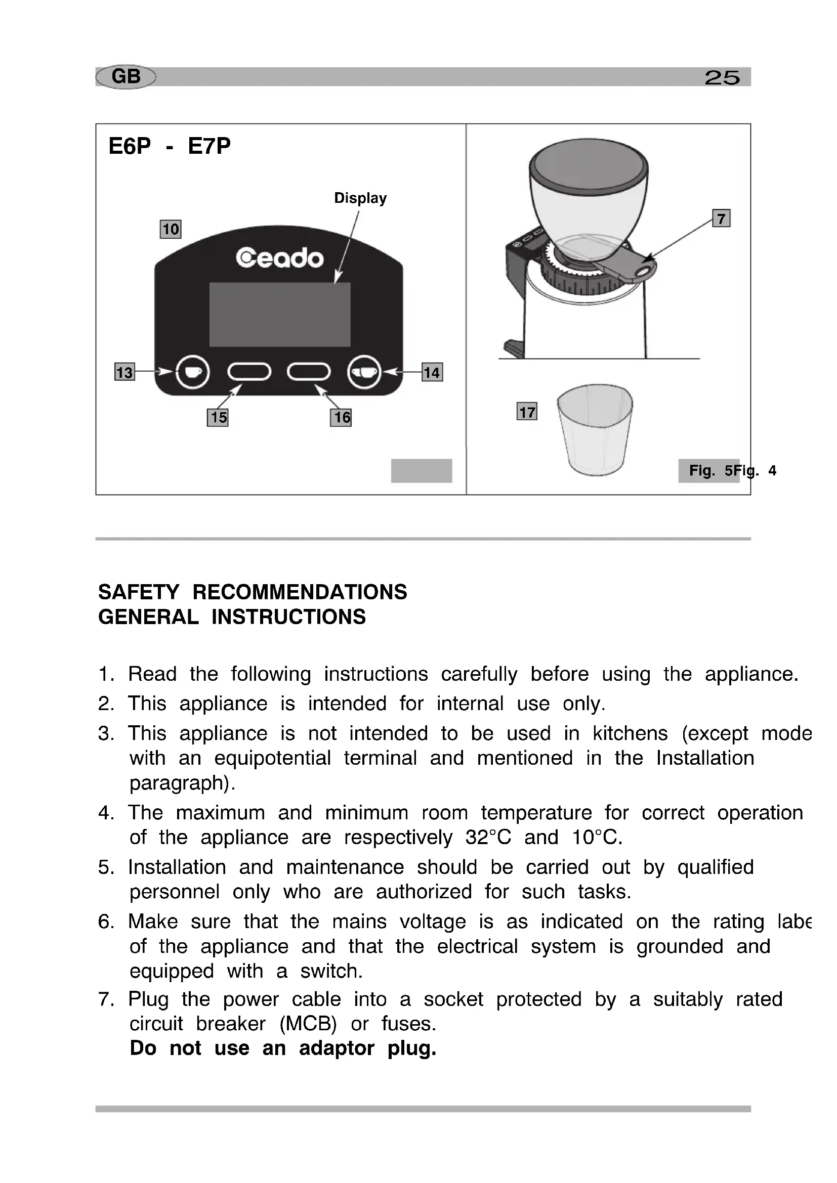 To consult these instructions on-line, visit the site www.ceado.comINSTALLATION Comply with the safety recommendations indicated above and hereafter when installing the appliance. For the installation of the appliance, qualified personnel must be present who are able to check the fineness of the grind.