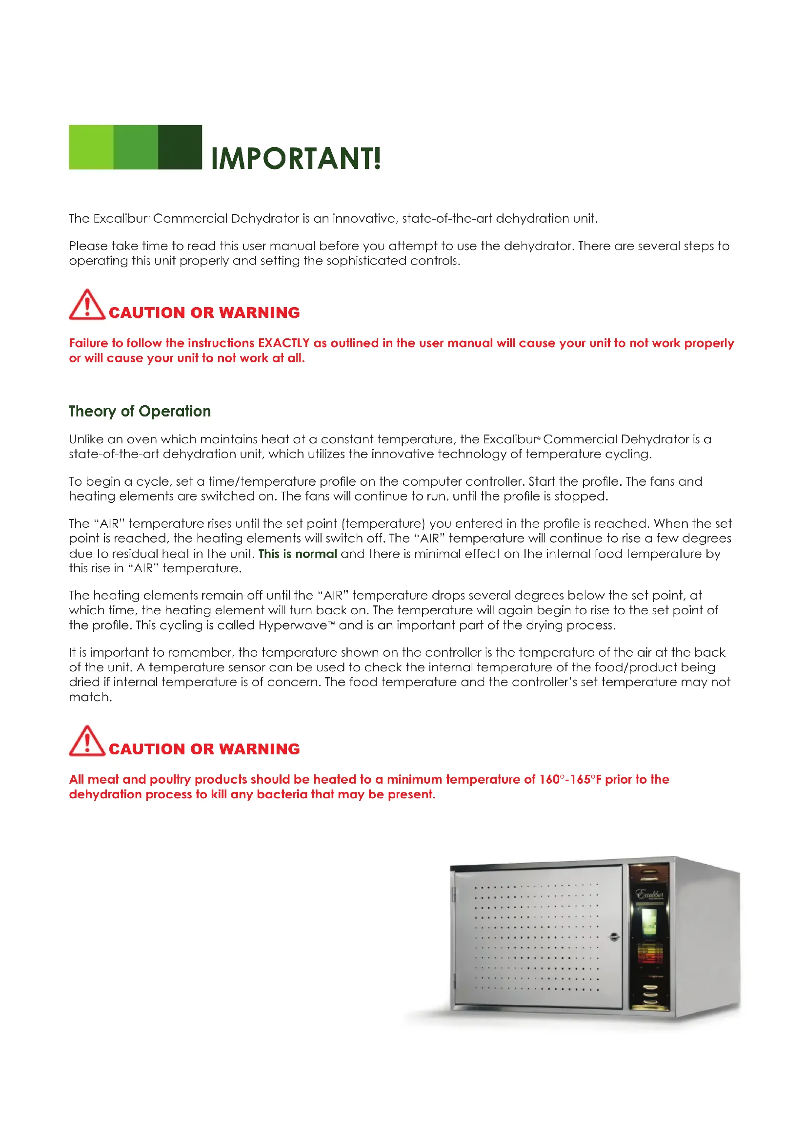 Failure to follow the instructions EXACTLY as outlined in the user manual will cause your unit to not work properly or will cause your unit to not work at all. Theory of Operation Unlike an oven which maintains heat at a constant temperature, the Excalibur