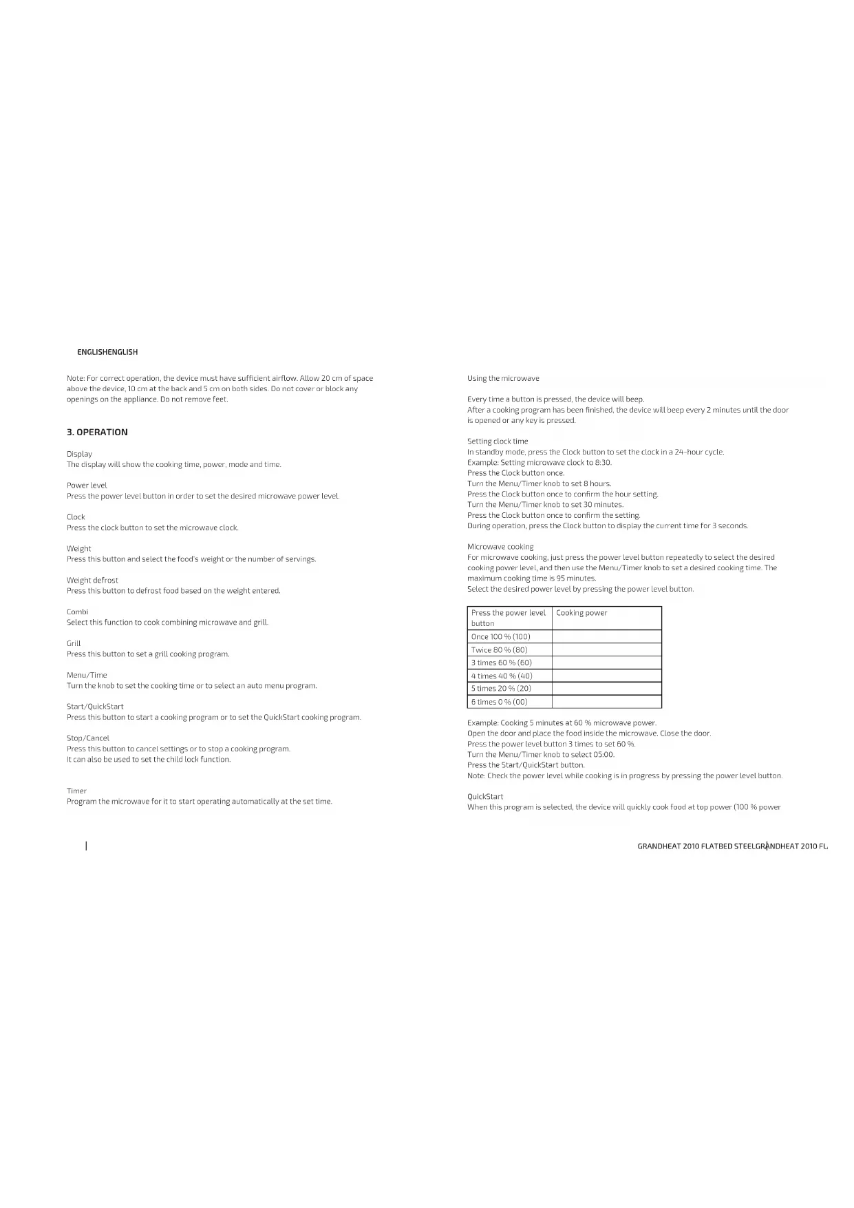 Display The display will show the cooking time, power, mode and time. Power level Press the power level button in order to set the desired microwave power level. Clock Press the clock button to set the microwave clock. Weight Press this button and select the food’s weight or the number of servings. Weight defrost Press this button to defrost food based on the weight entered. Combi Select this function to cook combining microwave and grill. Grill Press this button to set a grill cooking program. Menu/Time Turn the knob to set the cooking time or to select an auto menu program. Start/QuickStart Press this button to start a cooking program or to set the QuickStart cooking program. Stop/Cancel Press this button to cancel settings or to stop a cooking program. It can also be used to set the child lock function. Timer Program the microwave for it to start operating automatically at the set time.GRANDHEAT 2010 FLATBED STEELGRANDHEAT 2010 FLATBED STEEL 5150 ENGLISH ENGLISH Example: Setting combination 2 for 12 minutes. Press the Combi button twice. The screen will display CO-2. Turn the Menu/Timer knob to 12:00. Press the Start/QuickStart button. Note: During cooking, press the Combi button to check the cooking power level. Press Combination button Combination Cooking time Use Microwave Grill Once COMBI. 1 30 % 70 % Fish, potatoes or au gratin. Twice COMBI. 2 55 % 45 % Pudding, omelettes, baked potatoes and poultry. Child lock This function is designed to prevent little children from operating the device. When the device is not operated for 1 minute, this function will be automatically activated. All buttons will be inactive. To deactivate the function, open or close the door. Timer function This function allows scheduling a cooking program to start at an appointed time. Example: Suppose the present time is 08:00, and you want the microwave to start a cooking program at 11:30. In standby mode, set the desired cooking program. Press Timer button once. Turn the Menu/Timer knob to set 11:00 (hours). Press the Timer button once. Turn the Menu/Timer knob to set 11:30 (30 minutes). Press Start/QuickStart once. Note: The QuickStart function cannot be programmed. Auto menu programs These programs have cooking power levels and times set by default. When these programs are used, only the food type and weight have to be set. Open the door and place the food inside the microwave. Close the door. In standby mode, turn the Menu/Timer knob anticlockwise to select food code to specify the food to be cooked. Press the Weight button repeatedly to set the desired weight or number of servings. Press the Start/QuickStart button. output). The maximum cooking time for this program is 10 minutes. Open the door and place the food inside the microwave. Close the door. Press the QuickStart button repeatedly to set the desired cooking time. The device will start operating automatically. Every time the QuickStart button is pressed, the cooking time will increase by 30 secs. Weight defrost The microwave can defrost meat, poultry and seafood by weight. The time and the defrosting power are adjusted automatically once the weight is programmed. The weight range of frozen foods varies from 100 g to 1800 g. Example: Defrosting 600 g of shrimp. Place shrimps to be defrosted inside the microwave. Press the Weight defrost button once. Press the Weight button to select the weight of shrimps. Press the Start/QuickStart button. Note: The microwave will stop operating half-way through the cooking process to remind you to turn food over. After turning it over, press the Start/QuickStart button to continue the cooking program. Grill cooking The maximum cooking time is 95 minutes. This function is especially useful for cooking thin slices of meat, steaks, chops, sausages or pieces of chicken. It can also be used to heat sandwiches or cook dishes au gratin. Example: Grilling for 12 minutes. Open the door and place the food inside the microwave. Close the door. Press the Grill button. Turn the Menu/Timer knob to 12:00. Press the Start/QuickStart button. Combi The maximum cooking time for both Combi programs is 95 minutes. Combination 1 30 % microwave cooking and 70 % grill cooking. Suitable for sh and au gratin. Example: Setting combination 1 for 25 minutes. Press the Combi button once. The screen will display CO-1. Turn the Menu/Timer knob to 25:00. Press the Start/QuickStart button. Combination 2 55 % microwave cooking and 45 % grill cooking. Suitable for pudding, omelettes, bakes potatoes and poultry.GRANDHEAT 2010 FLATBED STEELGRANDHEAT 2010 FLATBED STEEL 5352 ENGLISH ENGLISH