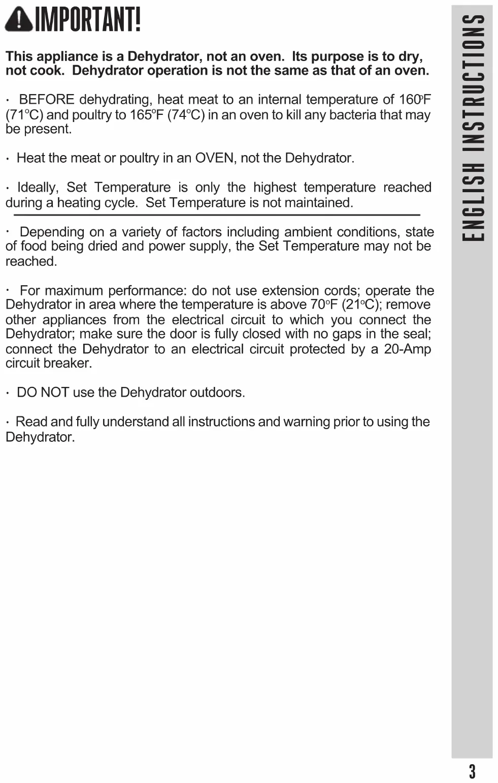 ENGLISH INSTRUCTIONS This appliance is a Dehydrator, not an oven. Its purpose is to dry, not cook. Dehydrator operation is not the same as that of an oven.