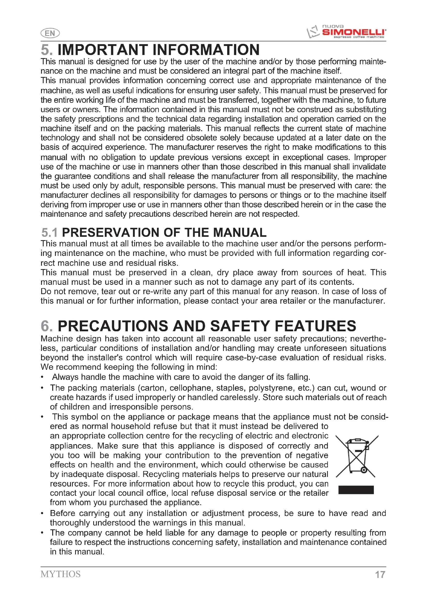 Machine design has taken into account all reasonable user safety precautions; neverthe- less, particular conditions of installation and/or handling may create unforeseen situations beyond the installer's control which will require case-by-case evaluation of residual risks. We recommend keeping the following in mind: Always handle the machine with care to avoid the danger of its falling. The packing materials (carton, cellophane, staples, polystyrene, etc.) can cut, wound or create hazards if used improperly or handled carelessly. Store such materials out of reach of children and irresponsible persons. This symbol on the appliance or package means that the appliance must not be consid- ered as normal household refuse but that it must instead be delivered to an appropriate collection centre for the recycling of electric and electronic appliances. Make sure that this appliance is disposed of correctly and you too will be making your contribution to the prevention of negative effects on health and the environment, which could otherwise be caused by inadequate disposal. Recycling materials helps to preserve our natural resources. For more information about how to recycle this product, you can contact your local council office, local refuse disposal service or the retailer from whom you purchased the appliance. Before carrying out any installation or adjustment process, be sure to have read and thoroughly understood the warnings in this manual. The company cannot be held liable for any damage to people or property resulting from failure to respect the instructions concerning safety, installation and maintenance contained in this manual.18