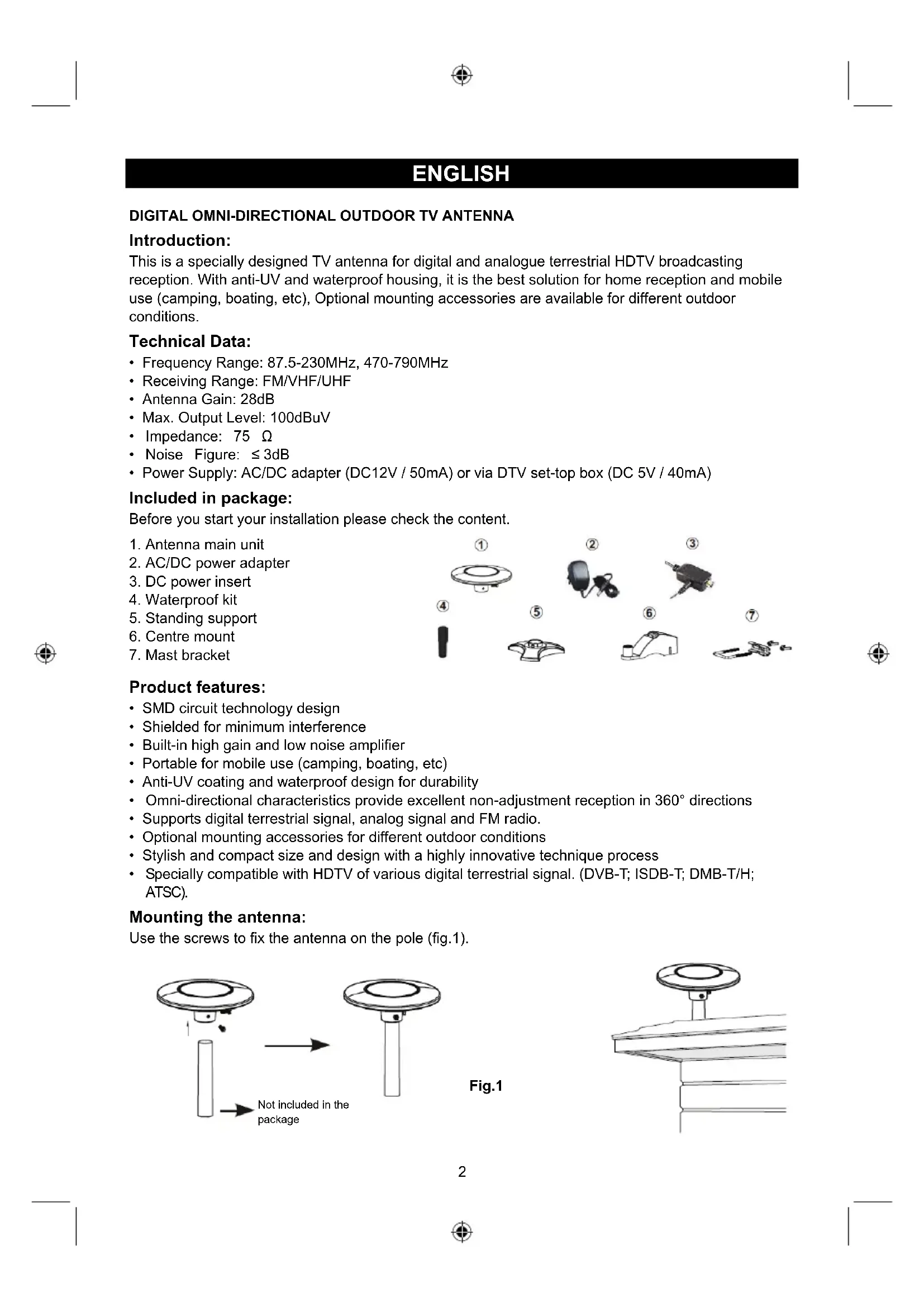 - Specially compatible with HDTV of various digital terrestrial signal. (DVB-T; ISDB-T; DMB-T/H; ATSC). Mounting the antenna: Use the screws to fix the antenna on the pole (fig.1). Not included in the package Fig.13 Use the centre mount and mast bracket accessories to fix the antenna to the pole (fig.2). Use the standing supporter accessory to keep the antenna standing on the table for indoor use (fig.3). For mobile use (boat, caravan etc.) (fig.4). Connect the “F” male connector of the coaxial cable to the “F” female connector of the antenna and screw the waterproof cap to the end of the connected “F” connector (fig.5). Installation: Installation via a separate AC/DC adapter: Fig.2 FREE LOCK Fig.3 Fig.4 Waterproof cap Fig.5 Digital Antenna AC/DC adapter 12V 50mA Digital Tuner STB Power Insert F-type connector liking bolt Coaxial cable Waterproof kit4 Installation via DTV set-top box: Note: After the antenna mounting and installation is finished, please adjust the antenna to its best position to receive the clearest TV picture. Then fix the antenna. Organize the coaxial cable for safety. Operation instruction: For the best reception, please check the following conditions: