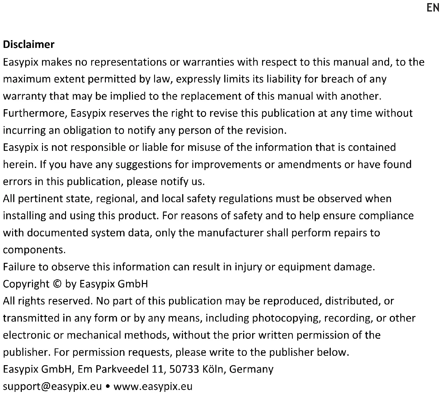 Disclaimer Easypix makes no representations or warranties with respect to this manual and, to the maximum extent permitted by law, expressly limits its liability for breach of any warranty that may be implied to the replacement of this manual with another. Furthermore, Easypix reserves the right to revise this publication at any time without incurring an obligation to notify any person of the revision. Easypix is not responsible or liable for misuse of the information that is contained herein. If you have any suggestions for improvements or amendments or have found errors in this publication, please notify us. All pertinent state, regional, and local safety regulations must be observed when installing and using this product. For reasons of safety and to help ensure compliance with documented system data, only the manufacturer shall perform repairs to components. Failure to observe this information can result in injury or equipment damage. Copyright © by Easypix GmbH All rights reserved. No part of this publication may be reproduced, distributed, or transmitted in any form or by any means, including photocopying, recording, or other electronic or mechanical methods, without the prior written permission of the publisher. For permission requests, please write to the publisher below. Easypix GmbH, Em Parkveedel 11, 50733 Köln, Germany support@easypix.eu • www.easypix.euEN