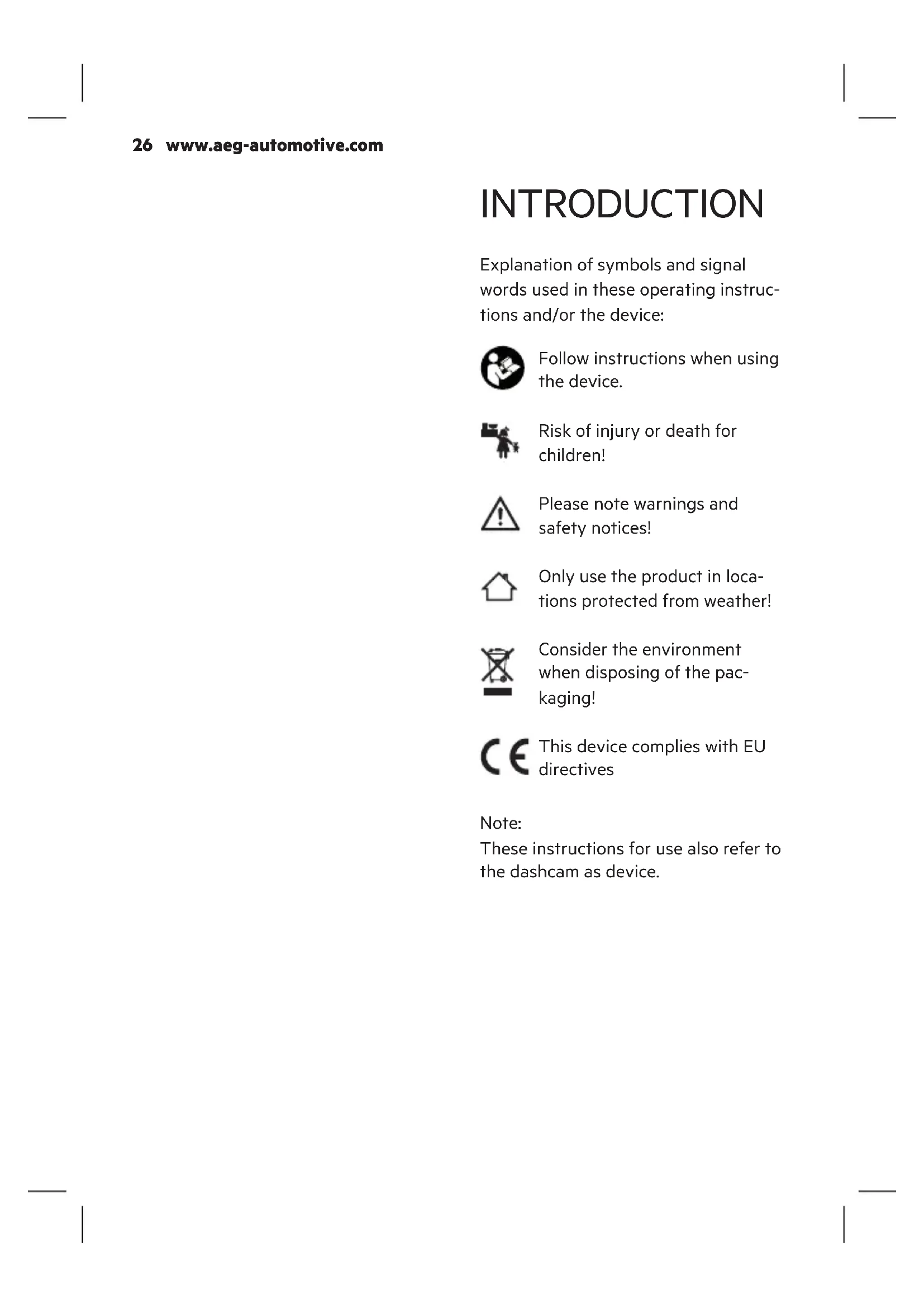 INTRODUCTION Explanation of symbols and signal words used in these operating instruc- tions and/or the device: Follow instructions when using the device. Risk of injury or death for children! Please note warnings and safety notices! Only use the product in loca- tions protected from weather! Consider the environment when disposing of the pac- kaging! This device complies with EU directives Note: These instructions for use also refer to the dashcam as device.27 English Normal use The DashCam is used to record events (e.g. traic) from the driver’s perspec- tive. Depending on the mode being used it will either record lm sequences or take pictures. It is powered via USB cable. Note: The privacy of others is protected by law. Recording third parties can be a criminal oence. You are responsible for your actions. Please obtain information about the laws. Using the device in traic may be subject to special local regulations in the respective country. This device is not intended to be used by children or persons with reduced physical, sensory or mental capabilities or lack of experience and knowledge, as they do not understand the resulting dangers. This device is not intended for com- mercial use. Any other use or modication of the device is considered improper and involves signicant risks. The manufac- turer assumes no liability for damages due to improper use. Contents Be sure to verify contents immediately upon opening the product. Check the product and all parts for damage. Do not use a defective product or parts.