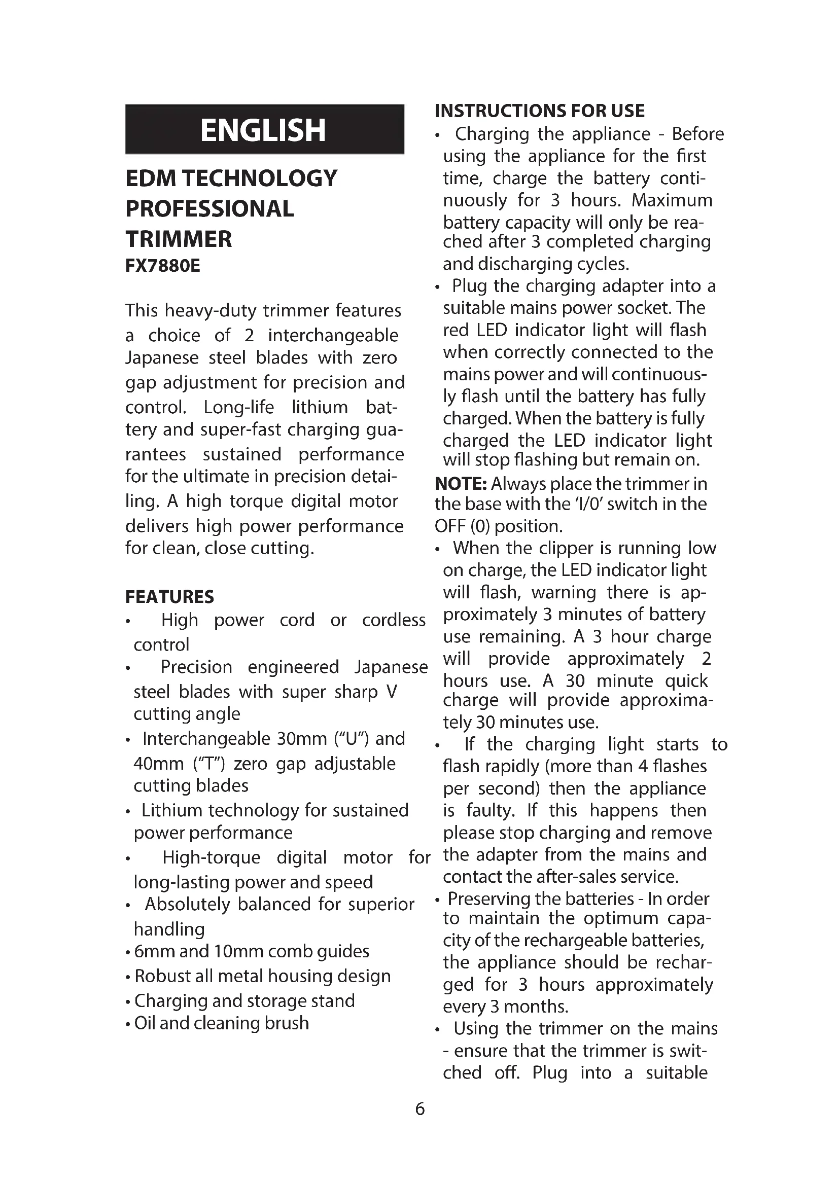 - Plug the charging adapter into a suitable mains power socket. The red LED indicator light will ash when correctly connected to the mains power and will continuous- ly ash until the battery has fully charged. When the battery is fully charged the LED indicator light will stop ashing but remain on. NOTE: Always place the trimmer in the base with the ‘I/0’ switch in the OFF (0) position.