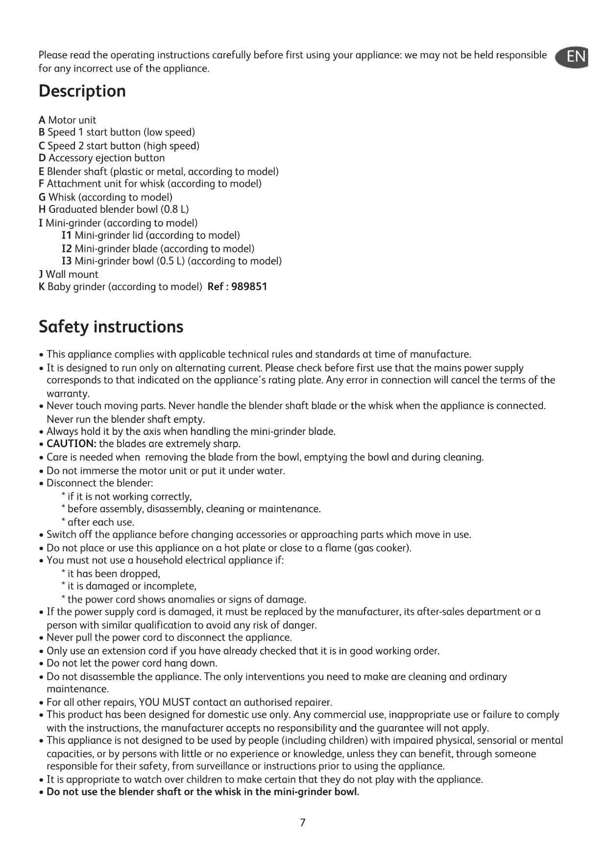 - Do not use the blender shaft or the whisk in the mini-grinder bowl. EN8 Bringing into service Using the blender shaft: Insert the shaft (E) onto the motor unit (A) until you hear the “click” that tells you it has locked. Your blender is ideal to prepare sauces, soups, cocktails, milk-shakes, mayonnaises, pancake mixes, waffle mixes and baby food preparations. To avoid splashing, first put the blender shaft into your preparation, plug in the appliance and then press button (B) or (C). Make a rotating and up and down movement to obtain even blending of the food. After use, switch the appliance off then press the ejection button (D) to disassemble the blender shaft accessory. Using the whisk: Fit the whisk (G) into the attachment unit (F), then slot the assembly onto the motor unit (A) until you hear the “click” that tells you it has locked. You can use the whisk to make light preparations (pancake mix, stiff egg white, chantilly cream, etc.). Switch the appliance on then press button (B) or (C). Unplug the appliance before pressing the ejection button (D) to disassemble the whisk accessory. Using the mini-grinder: Before using the mini-grinder: