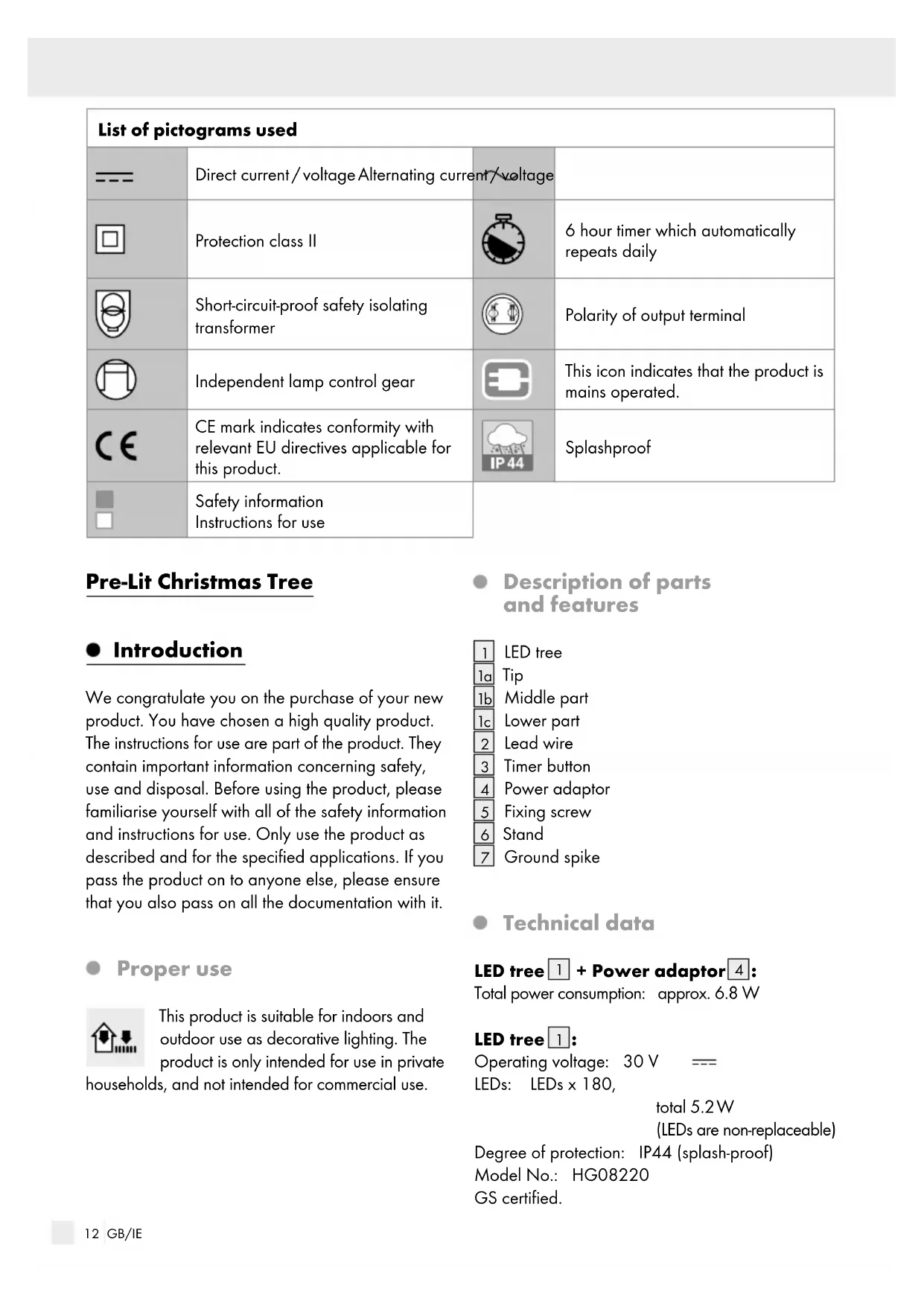 50/60Hz Operating voltage, secondary: 30 V , 7.2 W Protection class: Degree of protection: IP44 (splash-proof) Power adaptor (Model no. GP-SW300DC0240T-IP44(EU)) GS certified. SELV: Safety extra low voltage Ta: Maximum rated ambient temperature Tc: Rated maximum operating temperature of the case of a controlgear Included items 1 LED tree (1 tip, 1 middle part, 1 lower part) 1 Stand 1 Power adaptor 3 Fixing screws 2 Ground spikes 1 Operating instructions Safety information