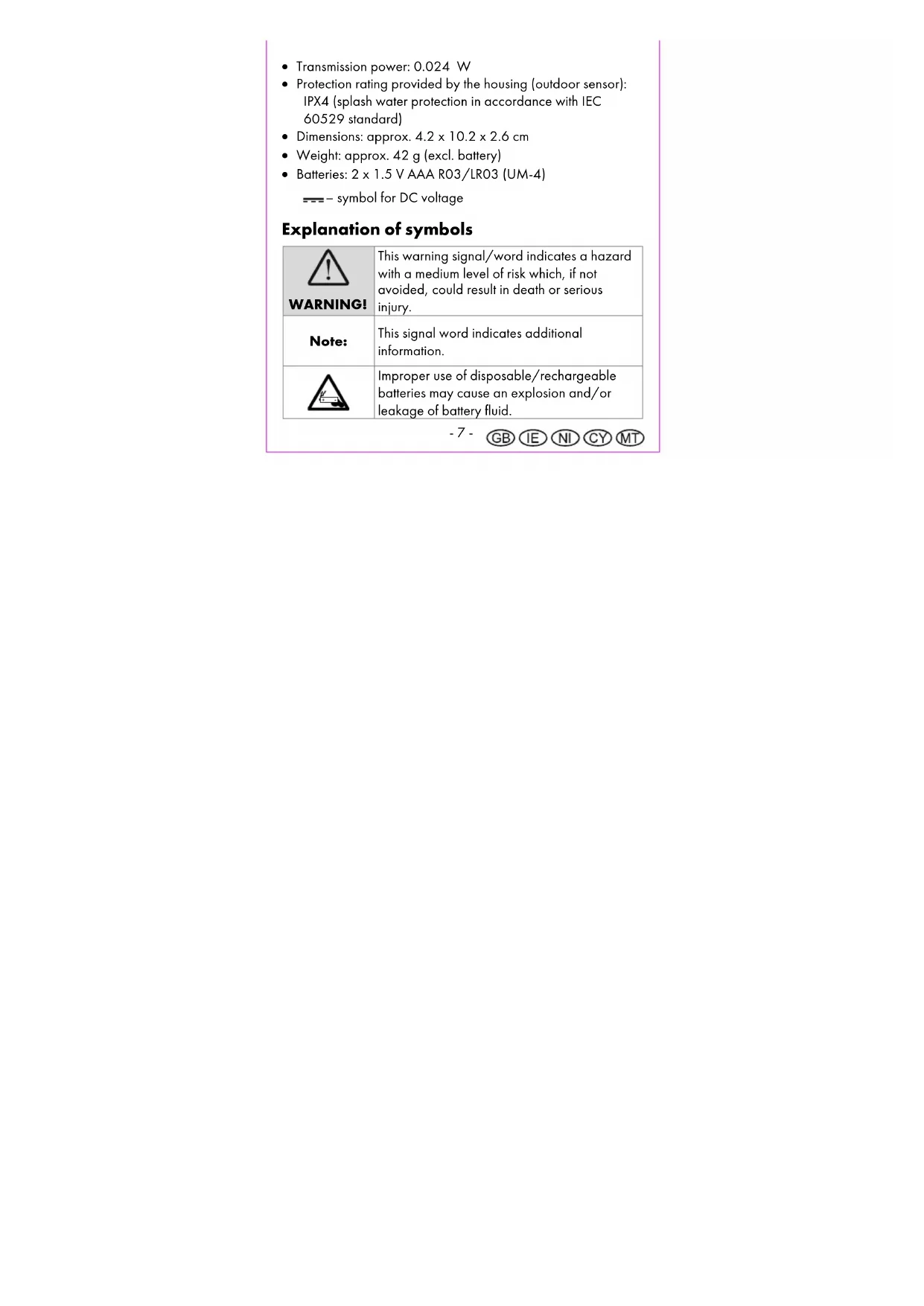 1 x operating instructions- 6 - Technical specifications Device Measuring range/temperature: -10 °C – 50 °C Temperature display/tolerance: +/- 1 °C (0 °C - 50 °C); +/- 1.5 °C (-10 °C - 0 °C) Measuring range/humidity: 20 % – 95 % Humidity indicator/tolerance: +/- 5 % Dimensions: approx. 15.0 x 9.5 x 2.3 cm Weight: approx. 160 g (excl. battery) Batteries: 2 x 1.5 V AAA R03/LR03 (UM-4) Wireless outdoor sensor Measuring range/temperature: -40 °C - 60 °C Temperature display/tolerance: +/- 1 °C (0 °C - 50 °C); +/- 2 °C (-40 °C - 0 °C, 50 °C - 60 °C) Measuring range/humidity: 20 % – 95 % Humidity indicator/tolerance: +/- 5 % Range: max. 50 m Transmission frequency: 433 MHz- 7 - Transmission power: 0.024 W Protection rating provided by the housing (outdoor sensor): IPX4 (splash water protection in accordance with IEC 60529 standard) Dimensions: approx. 4.2 x 10.2 x 2.6 cm Weight: approx. 42 g (excl. battery) Batteries: 2 x 1.5 V AAA R03/LR03 (UM-4) – symbol for DC voltage Explanation of symbols