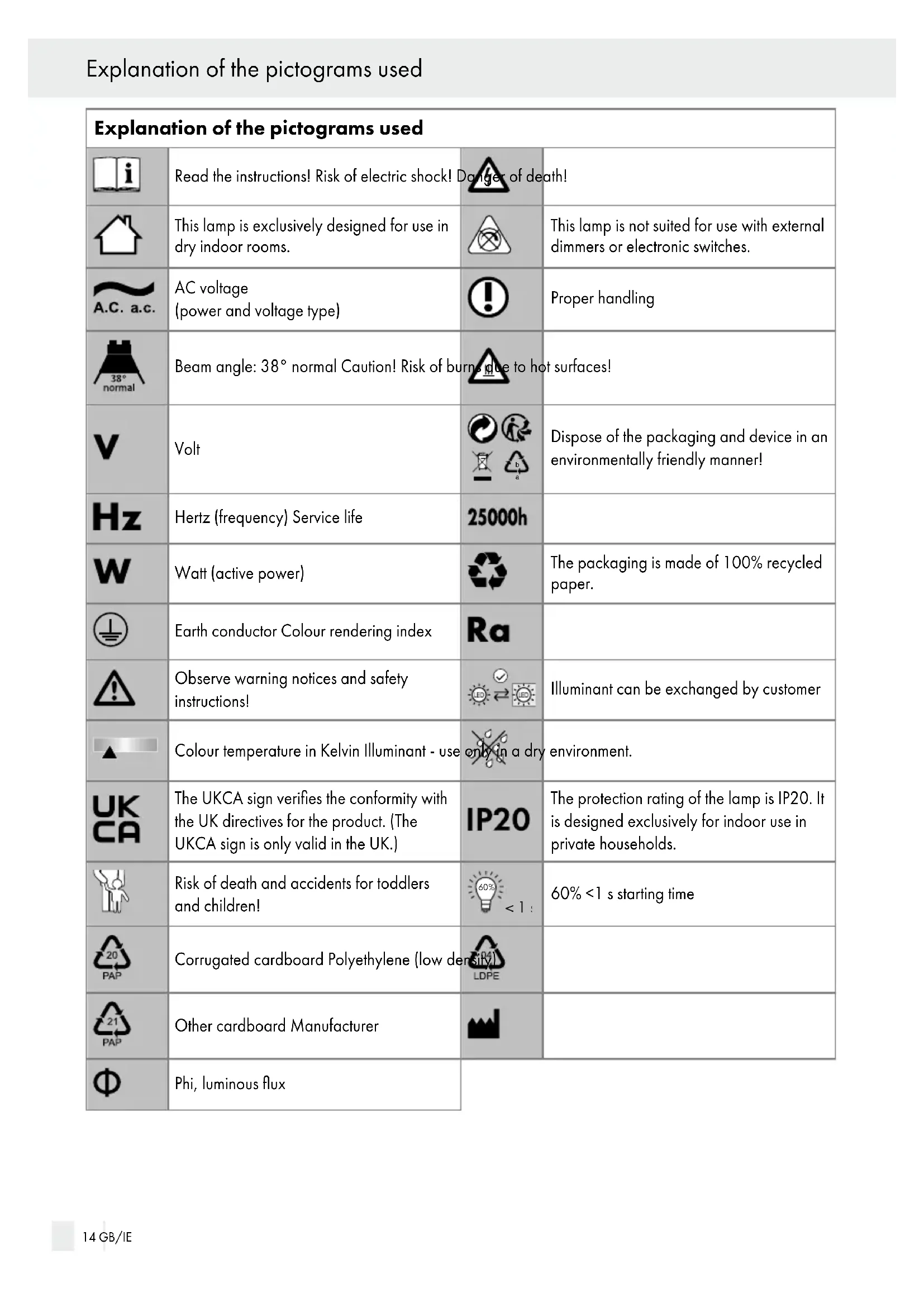 TODDLERS AND SMALL CHILDREN! Never leave children unsupervised with the pack aging materials. The packaging material poses a suffocation hazard. Children frequently underesti mate the dangers. Please always keep the product out of the reach of children. ■ This device may be used by children aged 8 years and up, as well as by persons with reduced phys ical, sensory or mental capacities, or lacking experi ence and / or knowledge, so long as they are supervised or instructed in the safe use of the device GB/IE 15 Introduction / Safetyand understand the associated risks. Do not allow children to play with the device. Cleaning and user maintenance must not be performed by children without supervision. Avoid the risk of fatal injury from electric shock ■ Ensure that a qualified electrician, or a person trained to carry out electrical installations, performs the electrical installation. ■ Always check the light, power supply, and mains cable for damage before plugging it in. Never use the light if it shows any signs of damage. WARNING! A damaged mains cable indicates a life-threatening danger due to electric shock. In the event of damage, repairs or other problems with the light please contact the service centre or a qualified electrician. ■ Prior to installation, remove the fuse or switch off the circuit breaker (0 setting) in the fuse box. ■ Prior to installation verify the mains voltage on site corresponds with the operating voltage required for the light (see “Technical data“). ■ Ensure that the light does not come into contact with water or other liquids under any circumstances. ■ Never open any of the components of the electrical equipment or insert any objects into the same components. This will pose a risk of fatal injury from electric shock. ■ Do not install the light on a wet or conductive substrate! Prevent fire and injury hazards RISK OF INJURY! Check the light for damage immediately after unpacking. ■ Do not mount the light with defective lamps and / or lamp lenses. In this case contact the service centre for a replacement.