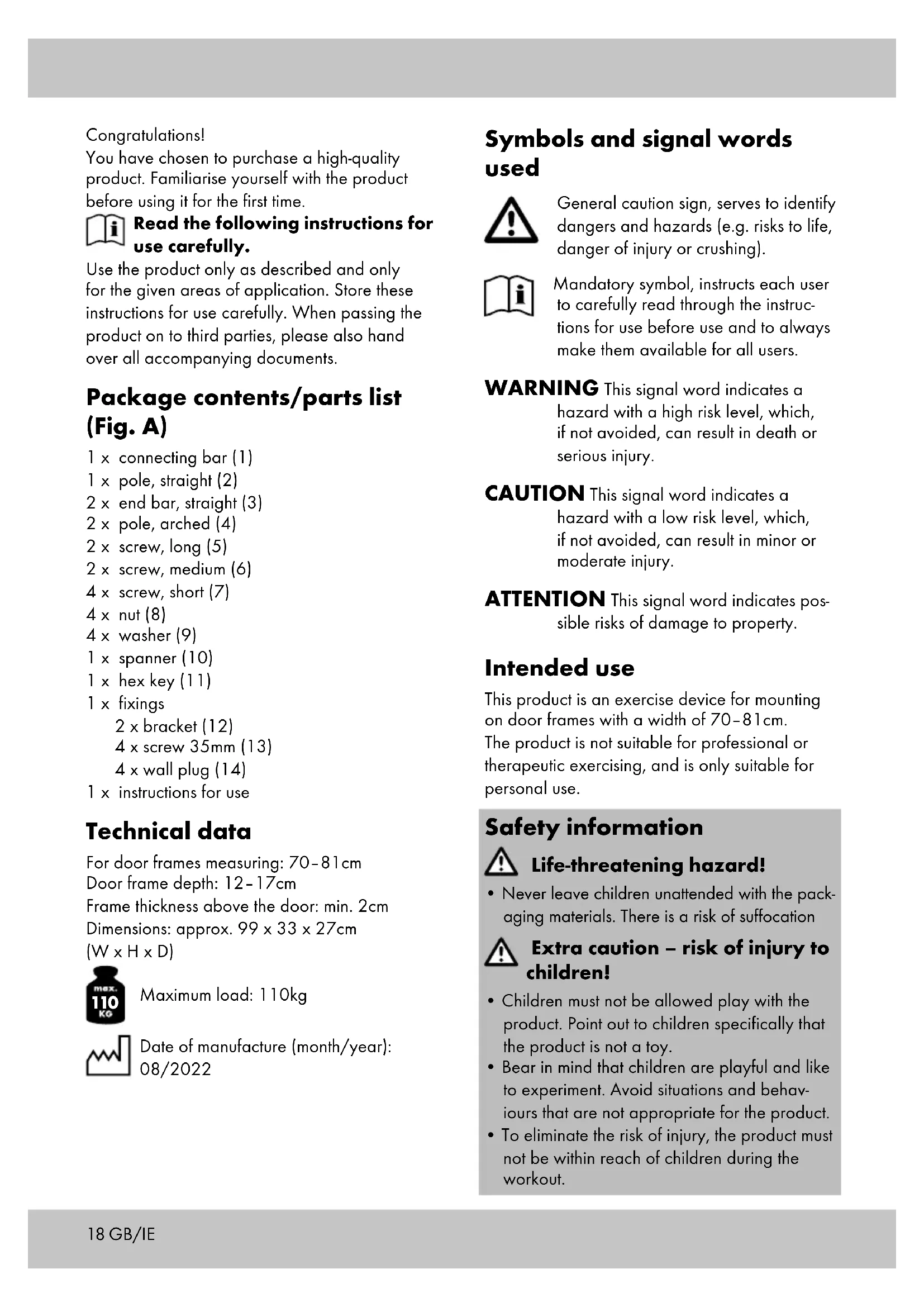 Maximum load: 110kg Date of manufacture (month/year): 08/2022 Symbols and signal words used General caution sign, serves to identify dangers and hazards (e.g. risks to life, danger of injury or crushing). Mandatory symbol, instructs each user to carefully read through the instruc- tions for use before use and to always make them available for all users. WARNING This signal word indicates a hazard with a high risk level, which, if not avoided, can result in death or serious injury. CAUTION This signal word indicates a hazard with a low risk level, which, if not avoided, can result in minor or moderate injury. ATTENTION This signal word indicates pos- sible risks of damage to property. Intended use This product is an exercise device for mounting on door frames with a width of 70–81cm. The product is not suitable for professional or therapeutic exercising, and is only suitable for personal use. Safety information Life-threatening hazard!