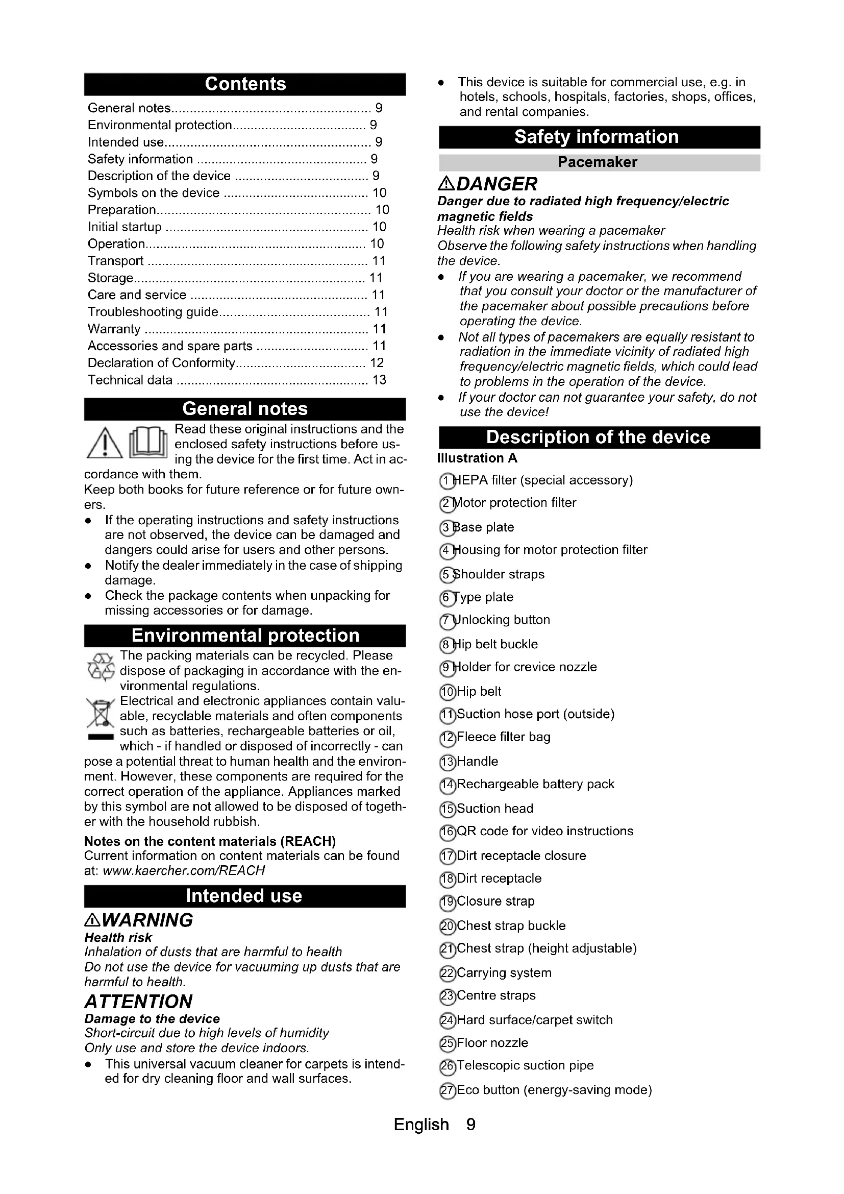 - 0,2English 9 Contents General notes Read these original instructions and the enclosed safety instructions before us- ing the device for the first time. Act in ac- cordance with them. Keep both books for future reference or for future own- ers. ● If the operating instructions and safety instructions are not observed, the device can be damaged and dangers could arise for users and other persons. ● Notify the dealer immediately in the case of shipping damage. ● Check the package contents when unpacking for missing accessories or for damage. Environmental protection The packing materials can be recycled. Please dispose of packaging in accordance with the en- vironmental regulations. Electrical and electronic appliances contain valu- able, recyclable materials and often components such as batteries, rechargeable batteries or oil, which - if handled or disposed of incorrectly - can pose a potential threat to human health and the environ- ment. However, these components are required for the correct operation of the appliance. Appliances marked by this symbol are not allowed to be disposed of togeth- er with the household rubbish. Notes on the content materials (REACH) Current information on content materials can be found at: www.kaercher.com/REACH Intended use 몇 WARNING Health risk Inhalation of dusts that are harmful to health Do not use the device for vacuuming up dusts that are harmful to health. ATTENTION Damage to the device Short-circuit due to high levels of humidity Only use and store the device indoors. ● This universal vacuum cleaner for carpets is intend- ed for dry cleaning floor and wall surfaces. ● This device is suitable for commercial use, e.g. in hotels, schools, hospitals, factories, shops, offices, and rental companies. Safety information Pacemaker DANGER Danger due to radiated high frequency/electric magnetic fields Health risk when wearing a pacemaker Observe the following safety instructions when handling the device. ● If you are wearing a pacemaker, we recommend that you consult your doctor or the manufacturer of the pacemaker about possible precautions before operating the device. ● Not all types of pacemakers are equally resistant to radiation in the immediate vicinity of radiated high frequency/electric magnetic fields, which could lead to problems in the operation of the device. ● If your doctor can not guarantee your safety, do not use the device! Description of the device Illustration A 1 HEPA filter (special accessory) 2 Motor protection filter 3 Base plate 4 Housing for motor protection filter 5 Shoulder straps 6 Type plate 7 Unlocking button 8 Hip belt buckle 9 Holder for crevice nozzle 10 Hip belt 11 Suction hose port (outside) 12 Fleece filter bag 13 Handle 14 Rechargeable battery pack 15 Suction head 16 QR code for video instructions 17 Dirt receptacle closure 18 Dirt receptacle 19 Closure strap 20 Chest strap buckle 21 Chest strap (height adjustable) 22 Carrying system 23 Centre straps 24 Hard surface/carpet switch 25 Floor nozzle 26 Telescopic suction pipe 27 Eco button (energy-saving mode) General notes p. 9