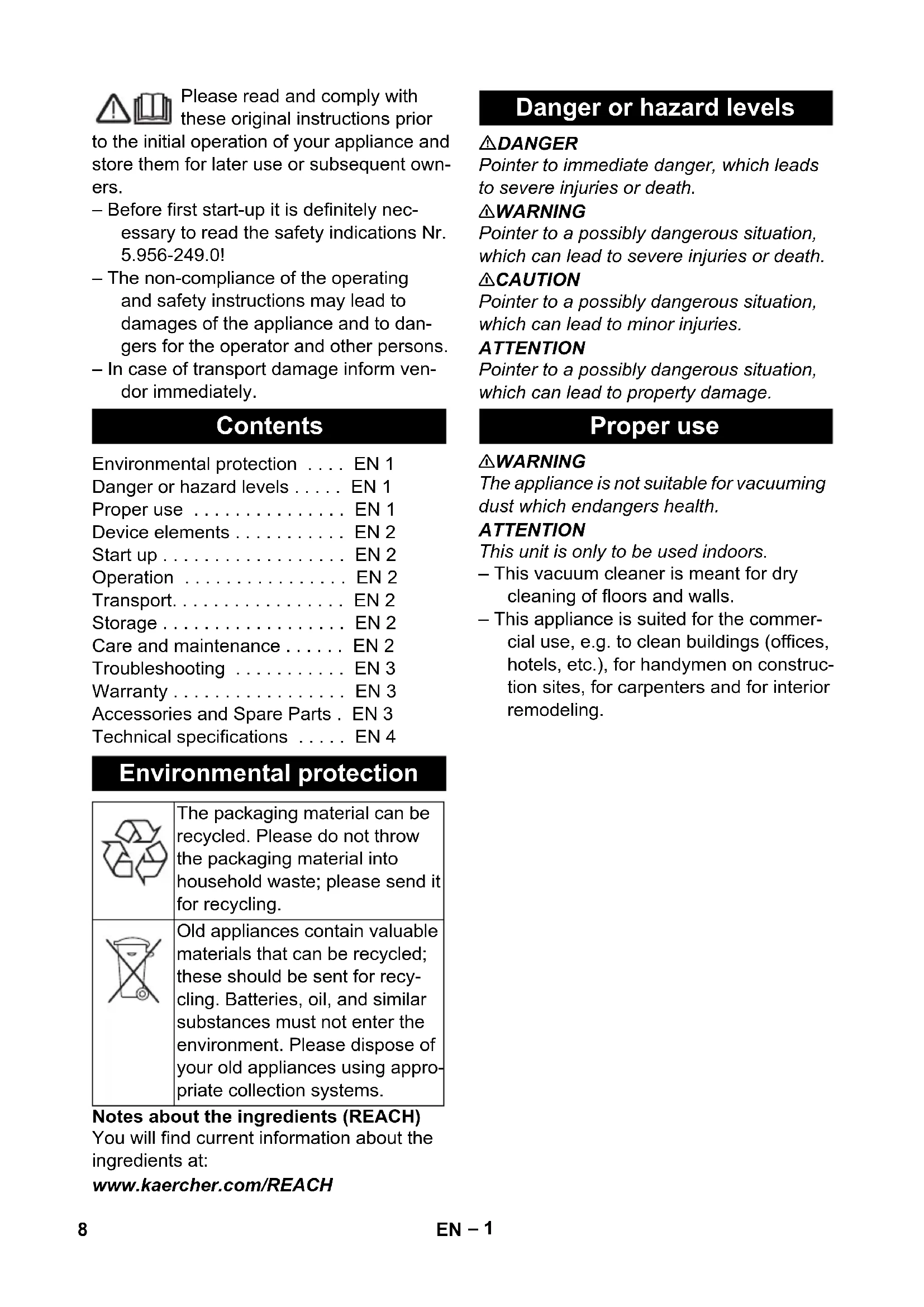 Teile-Nr. Kabellänge EU 9.770-650.0 7,5 m 7DE– 1 Please read and comply with these original instructions prior to the initial operation of your appliance and store them for later use or subsequent own- ers. – Before first start-up it is definitely nec- essary to read the safety indications Nr. 5.956-249.0! – The non-compliance of the operating and safety instructions may lead to damages of the appliance and to dan- gers for the operator and other persons. – In case of transport damage inform ven- dor immediately. Notes about the ingredients (REACH) You will find current information about the ingredients at: www.kaercher.com/REACH DANGER Pointer to immediate danger, which leads to severe injuries or death. 몇 WARNING Pointer to a possibly dangerous situation, which can lead to severe injuries or death. 몇 CAUTION Pointer to a possibly dangerous situation, which can lead to minor injuries. ATTENTION Pointer to a possibly dangerous situation, which can lead to property damage. 몇 WARNING The appliance is not suitable for vacuuming dust which endangers health. ATTENTION This unit is only to be used indoors. – This vacuum cleaner is meant for dry cleaning of floors and walls. – This appliance is suited for the commer- cial use, e.g. to clean buildings (offices, hotels, etc.), for handymen on construc- tion sites, for carpenters and for interior remodeling. Contents Environmental protection ... EN 1 Danger or hazard levels ... EN 1 Proper use ... EN 1 Device elements ... EN 2 Start up ... EN 2 Operation ... EN 2 Transport... EN 2 Storage ... EN 2 Care and maintenance ... EN 2 Troubleshooting ... EN 3 Warranty ... EN 3 Accessories and Spare Parts . EN 3 Technical specifications ... EN 4 Environmental protection The packaging material can be recycled. Please do not throw the packaging material into household waste; please send it for recycling. Old appliances contain valuable materials that can be recycled; these should be sent for recy- cling. Batteries, oil, and similar substances must not enter the environment. Please dispose of your old appliances using appro- priate collection systems. Danger or hazard levels Proper use 8 EN– 2 1 Paper filter bag 2 Suction support 3 Suction hose with manifold 4 Nameplate 5 Carrying handle 6 Cable hook 7 Power cord 8 Suction head 9 Suction head lock 10 Storage for accessories 11 Steering roller 12 Dirt receptacle 13 Main switch 14 Switch between hard surface/carpet 15 Floor nozzle 16 Suction tube 17 Main filter basket 18 Motor protection filter 19 Grid of the motor protection filter Check whether main filter basket has been inserted into the appliance. 1 Operation with paper filter bag 2 Operation without filter bag Release and remove the suction head. Remove the main filter basket. Insert the paper filter bag. Insert main filter basket. Insert and lock the suction head. Plug in the mains plug. Switch on the appliance at the main switch. Set the selection switch of the floor noz- zle to hard surface or carpet. Perform the cleaning operation. Switch off the appliance at the main switch. Pull out the mains plug. Empty the container. 몇 CAUTION Risk of injury and damage! Observe the weight of the appliance when you transport it. When transporting in vehicles, secure the appliance according to the guide- lines from slipping and tipping over. 몇 CAUTION Risk of injury and damage! Note the weight of the appliance in case of storage. This appliance must only be stored in inte- rior rooms. DANGER First pull out the plug from the mains before carrying out any tasks on the machine. Main filter basket (washable), clean it under running water if necessary. ATTENTION Risk of damage! Never insert the main filter basket while wet. Device elements Start up Operating modes Installation of the filter bag Operation Turning on the Appliance Cleaning operations Turn off the appliance After each operation Transport Storage Care and maintenance Clean main filter basket 9EN– 3 Release and remove the suction head. Push the grids of the motor protection filter down, turn and remove. Remove the motor protection filter. Insert the new motor protection filter. Insert the grid of the motor protection fil- ter and lock it into place. Insert and lock the suction head. DANGER First pull out the plug from the mains before carrying out any tasks on the machine. – Motor thermal protector has responded. Exchange the paper filter bag. Replace motor protection filter. Check all parts for plugging. Switching back on after the motor turbine has cooled off, after approx. 30 to 40 min- utes. Check the receptacle and the fuse of the power supply. Check the power cable and the power plug of the device. Turn on the appliance. Remove choking of suction nozzle, suc- tion tube or suction hose. Exchange the paper filter bag. Clean the main filter basket under run- ning water. Insert/lock the suction head correctly. Replace defective suction hose. Replace motor protection filter. Exchange the paper filter bag. Check the paper filter bag. Insert/lock the suction head correctly. Insert undamaged main filter basket. Reinsert motor protection filter correctly. If malfunction can not be fixed, the de- vice must be checked by customer ser- vice. The warranty terms published by the rele- vant sales company are applicable in each country. We will repair potential failures of your appliance within the warranty period free of charge, provided that such failure is caused by faulty material or defects in man- ufacturing. In the event of a warranty claim please contact your dealer or the nearest authorized Customer Service centre. Please submit the proof of purchase. Only use original accessories and spare parts, they ensure the safe and trouble-free operation of the device. For information about accessories and spare parts, please visit www.kaercher.com. Replace motor protection filter Troubleshooting The appliance shuts off during the operation Suction turbine does not run Suction capacity decre