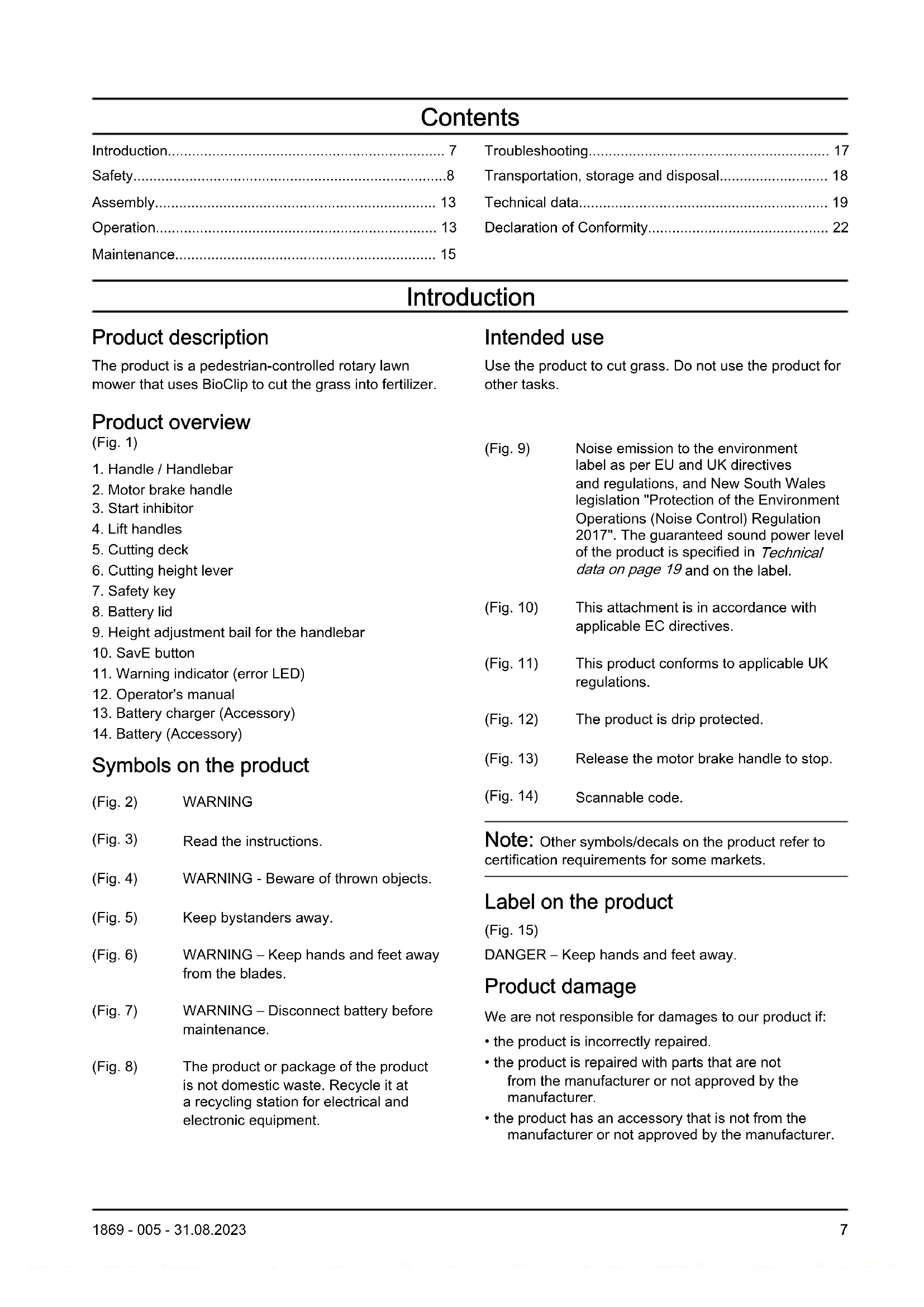 Symbols on the product (Fig. 2) WARNING (Fig. 3) Read the instructions. (Fig. 4) WARNING - Beware of thrown objects. (Fig. 5) Keep bystanders away. (Fig. 6) WARNING – Keep hands and feet away from the blades. (Fig. 7) WARNING – Disconnect battery before maintenance. (Fig. 8) The product or package of the product is not domestic waste. Recycle it at a recycling station for electrical and electronic equipment. (Fig. 9) Noise emission to the environment label as per EU and UK directives and regulations, and New South Wales legislation "Protection of the Environment Operations (Noise Control) Regulation 2017". The guaranteed sound power level of the product is specified in Technical data on page 19 and on the label. (Fig. 10) This attachment is in accordance with applicable EC directives. (Fig. 11) This product conforms to applicable UK regulations. (Fig. 12) The product is drip protected. (Fig. 13) Release the motor brake handle to stop. (Fig. 14) Scannable code. Note: Other symbols/decals on the product refer to certification requirements for some markets. Label on the product (Fig. 15) DANGER – Keep hands and feet away. Product damage We are not responsible for damages to our product if: