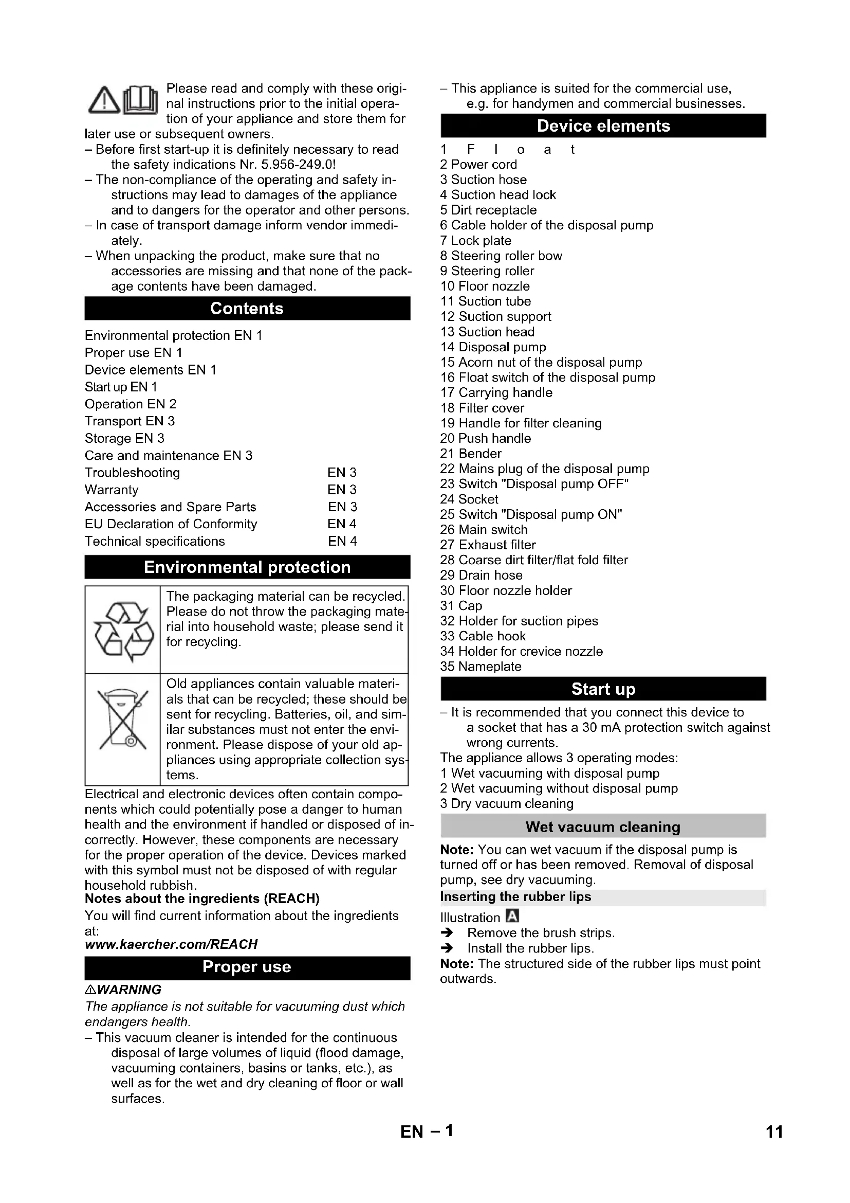 Teile-Nr. Kabellänge EU 6.649-413.0 10 m CH 6.649-254.0 10 m 10 DE– 1 Please read and comply with these origi- nal instructions prior to the initial opera- tion of your appliance and store them for later use or subsequent owners. – Before first start-up it is definitely necessary to read the safety indications Nr. 5.956-249.0! – The non-compliance of the operating and safety in- structions may lead to damages of the appliance and to dangers for the operator and other persons. – In case of transport damage inform vendor immedi- ately. – When unpacking the product, make sure that no accessories are missing and that none of the pack- age contents have been damaged. Electrical and electronic devices often contain compo- nents which could potentially pose a danger to human health and the environment if handled or disposed of in- correctly. However, these components are necessary for the proper operation of the device. Devices marked with this symbol must not be disposed of with regular household rubbish. Notes about the ingredients (REACH) You will find current information about the ingredients at: www.kaercher.com/REACH 몇 WARNING The appliance is not suitable for vacuuming dust which endangers health. – This vacuum cleaner is intended for the continuous disposal of large volumes of liquid (flood damage, vacuuming containers, basins or tanks, etc.), as well as for the wet and dry cleaning of floor or wall surfaces. – This appliance is suited for the commercial use, e.g. for handymen and commercial businesses. 1Float 2 Power cord 3 Suction hose 4 Suction head lock 5 Dirt receptacle 6 Cable holder of the disposal pump 7 Lock plate 8 Steering roller bow 9 Steering roller 10 Floor nozzle 11 Suction tube 12 Suction support 13 Suction head 14 Disposal pump 15 Acorn nut of the disposal pump 16 Float switch of the disposal pump 17 Carrying handle 18 Filter cover 19 Handle for filter cleaning 20 Push handle 21 Bender 22 Mains plug of the disposal pump 23 Switch "Disposal pump OFF" 24 Socket 25 Switch "Disposal pump ON" 26 Main switch 27 Exhaust filter 28 Coarse dirt filter/flat fold filter 29 Drain hose 30 Floor nozzle holder 31 Cap 32 Holder for suction pipes 33 Cable hook 34 Holder for crevice nozzle 35 Nameplate – It is recommended that you connect this device to a socket that has a 30 mA protection switch against wrong currents. The appliance allows 3 operating modes: 1 Wet vacuuming with disposal pump 2 Wet vacuuming without disposal pump 3 Dry vacuum cleaning Note: You can wet vacuum if the disposal pump is turned off or has been removed. Removal of disposal pump, see dry vacuuming. Illustration Remove the brush strips. Install the rubber lips. Note: The structured side of the rubber lips must point outwards. Contents Environmental protection EN 1 Proper use EN 1 Device elements EN 1 Start up EN 1 Operation EN 2 Transport EN 3 Storage EN 3 Care and maintenance EN 3 Troubleshooting EN 3 Warranty EN 3 Accessories and Spare Parts EN 3 EU Declaration of Conformity EN 4 Technical specifications EN 4 Environmental protection The packaging material can be recycled. Please do not throw the packaging mate- rial into household waste; please send it for recycling. Old appliances contain valuable materi- als that can be recycled; these should be sent for recycling. Batteries, oil, and sim- ilar substances must not enter the envi- ronment. Please dispose of your old ap- pliances using appropriate collection sys- tems. Proper use Device elements Start up Wet vacuum cleaning Inserting the rubber lips 11EN– 2 Illustration Release and remove the suction head. Pull the paper filter bag/fleece filter bag towards the rear. Insert and lock the suction head. – To vacuum wet dirt, first remove the paper or fleece filter bag. Illustration Release and remove the suction head. Remove the membrane filter. Insert and lock the suction head. – To suck wet dirt, always remove the membrane fil- ter. Open filter door. Take out the flat folded filter. Install the coarse dirt filter. Close the filter door, it must lock into place. Illustration Remove the cap. Connect the disposal hose (nominal width 3/4" or larger). 몇 CAUTION Please observe the local provisions regarding the wastewater treatment. Illustration Drain off dirty water through the drainage hose. ATTENTION The coarse dirt filter must never be removed during vac- uuming. – Wet vacuuming without disposal pump: It is recom- mended to use a special filter bag (wet) (see Filter systems). – If the maximum liquid level is reached the appli- ance will turn off automatically. – After the wet vacuuming: Clean the floater, contain- er and the disposal pump if necessary, using a damp rag and dry them. ATTENTION Prior to dry vacuuming: Remove the disposal pump and install the flat fold filter. Note: You must use a flat fold filter during dry vacuum- ing. ATTENTION The flat pleated filter must always be in place while vac- uuming. – To vacuum fine dust, you can also use an addition- al paper filter bag, a fleece filter bag or a membrane filter. Unplug the mains plug of the disposal pump. Release and remove the suction head. Illustration Unscrew the acorn nut of the disposal pump. Remove the cable holder of the disposal pump and replace it with a locking cap. Remove the disposal pump and plastic insert si- multaneously from the container as the float switch of the disposal pump is attached to the plastic in- sert and could otherwise be damaged. Illustration Install the locking cap instead of the disposal hose. Insert and lock the suction head. Note: The flat fold filter is not included in the delivery. Open filter door. Take out the coarse dirt filter. Install the flat fold filter. Close the filter door, it must lock into place. Illustration Remove the rubber lips. Install the brush strip. Note: A paper filter bag or a fleece filter bag is not in- cluded in the delivery. Illustration Release and remove the suction head.