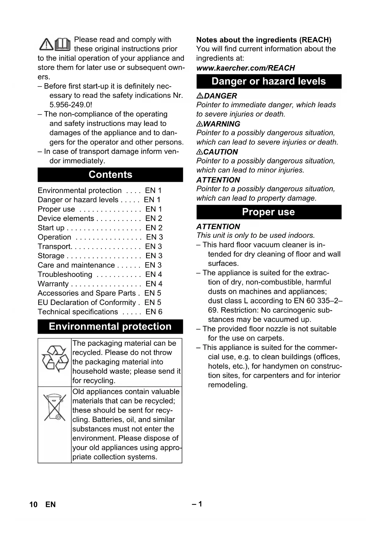 Teile-Nr. Kabellänge CH 6.650-837.0 7,5 m 9DE– 1 Please read and comply with these original instructions prior to the initial operation of your appliance and store them for later use or subsequent own- ers. – Before first start-up it is definitely nec- essary to read the safety indications Nr. 5.956-249.0! – The non-compliance of the operating and safety instructions may lead to damages of the appliance and to dan- gers for the operator and other persons. – In case of transport damage inform ven- dor immediately. Notes about the ingredients (REACH) You will find current information about the ingredients at: www.kaercher.com/REACH DANGER Pointer to immediate danger, which leads to severe injuries or death. 몇 WARNING Pointer to a possibly dangerous situation, which can lead to severe injuries or death. 몇 CAUTION Pointer to a possibly dangerous situation, which can lead to minor injuries. ATTENTION Pointer to a possibly dangerous situation, which can lead to property damage. ATTENTION This unit is only to be used indoors. – This hard floor vacuum cleaner is in- tended for dry cleaning of floor and wall surfaces. – The appliance is suited for the extrac- tion of dry, non-combustible, harmful dusts on machines and appliances; dust class L according to EN 60 335–2–
