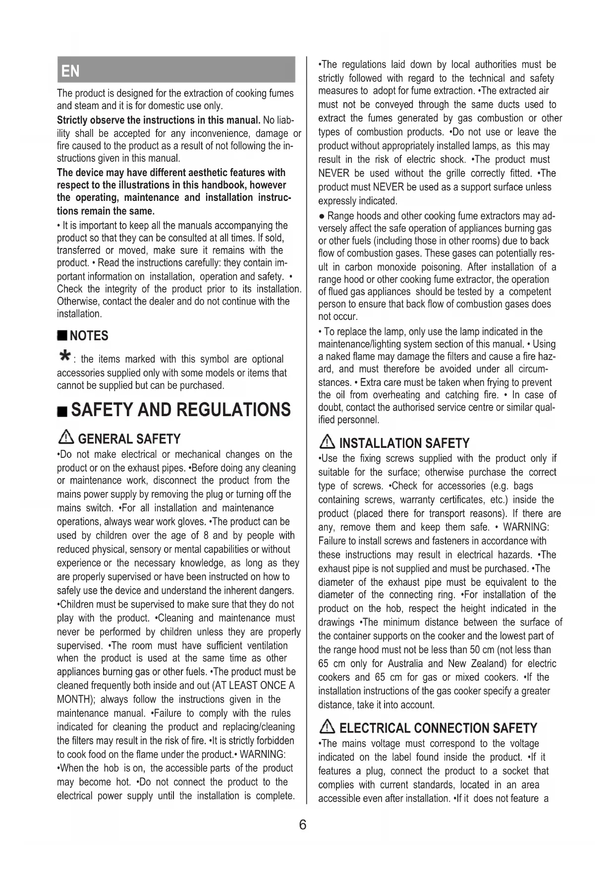 - The regulations laid down by local authorities must be strictly followed with regard to the technical and safety measures to adopt for fume extraction. •The extracted air must not be conveyed through the same ducts used to extract the fumes generated by gas combustion or other types of combustion products. •Do not use or leave the product without appropriately installed lamps, as this may result in the risk of electric shock. •The product must NEVER be used without the grille correctly fitted. •The product must NEVER be used as a support surface unless expressly indicated. ● Range hoods and other cooking fume extractors may ad- versely affect the safe operation of appliances burning gas or other fuels (including those in other rooms) due to back flow of combustion gases. These gases can potentially res- ult in carbon monoxide poisoning. After installation of a range hood or other cooking fume extractor, the operation of flued gas appliances should be tested by a competent person to ensure that back flow of combustion gases does not occur.