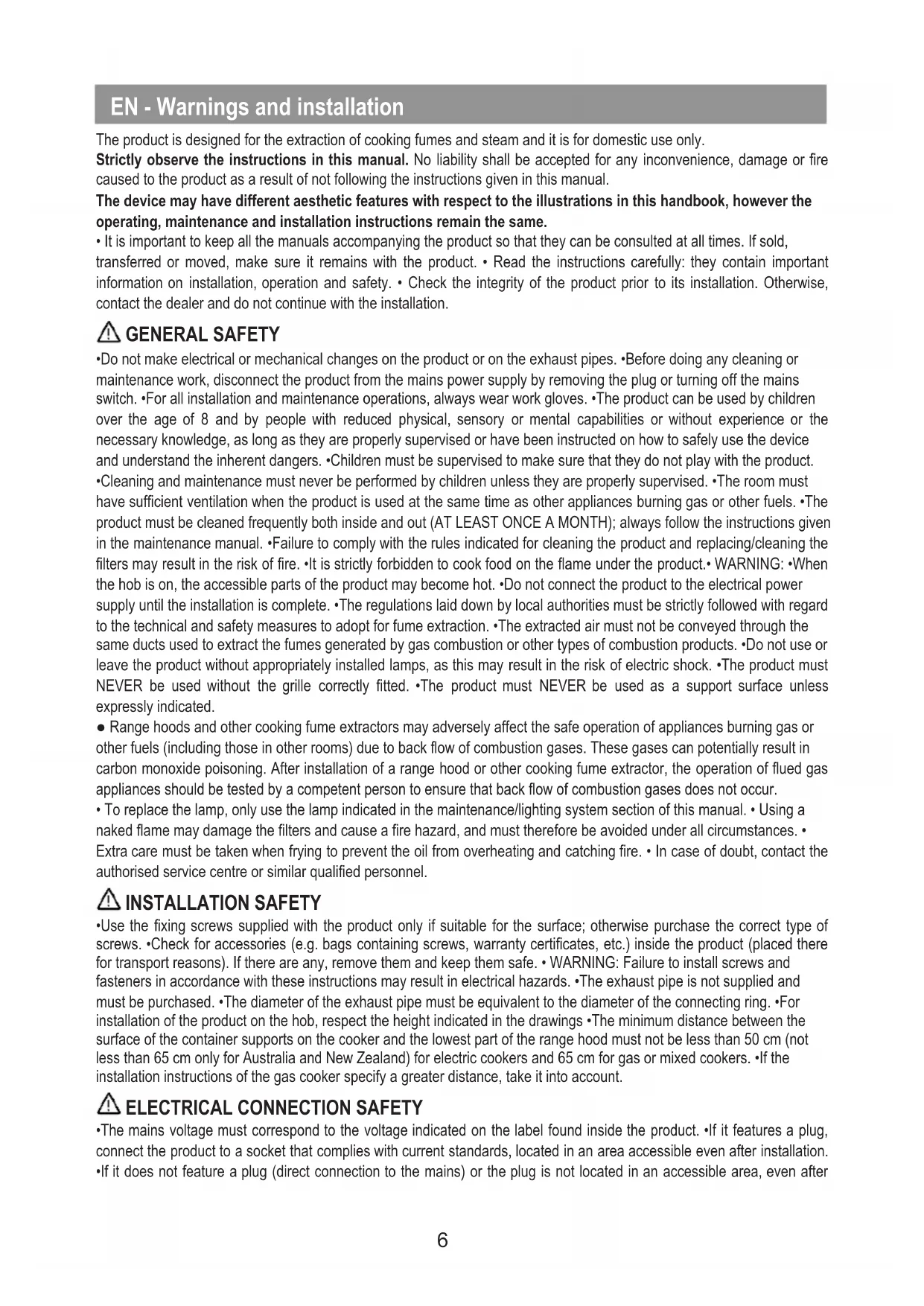 - To replace the lamp, only use the lamp indicated in the maintenance/lighting system section of this manual. • Using a naked flame may damage the filters and cause a fire hazard, and must therefore be avoided under all circumstances. • Extra care must be taken when frying to prevent the oil from overheating and catching fire. • In case of doubt, contact the authorised service centre or similar qualified personnel. INSTALLATION SAFETY