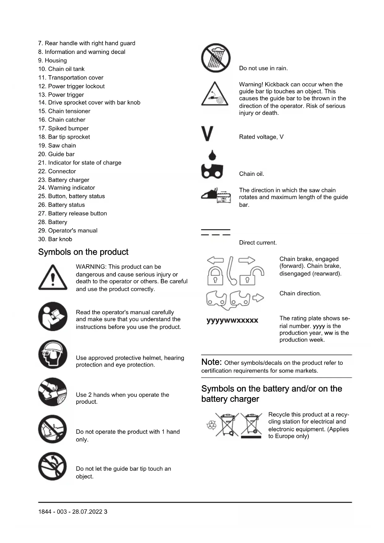 1844 - 003 - 28.07.2022• Only use replacement guide bars and saw chains specified by the manufacturer. Incorrect replacement guide bars and saw chains may cause chain breakage and/or kickback.