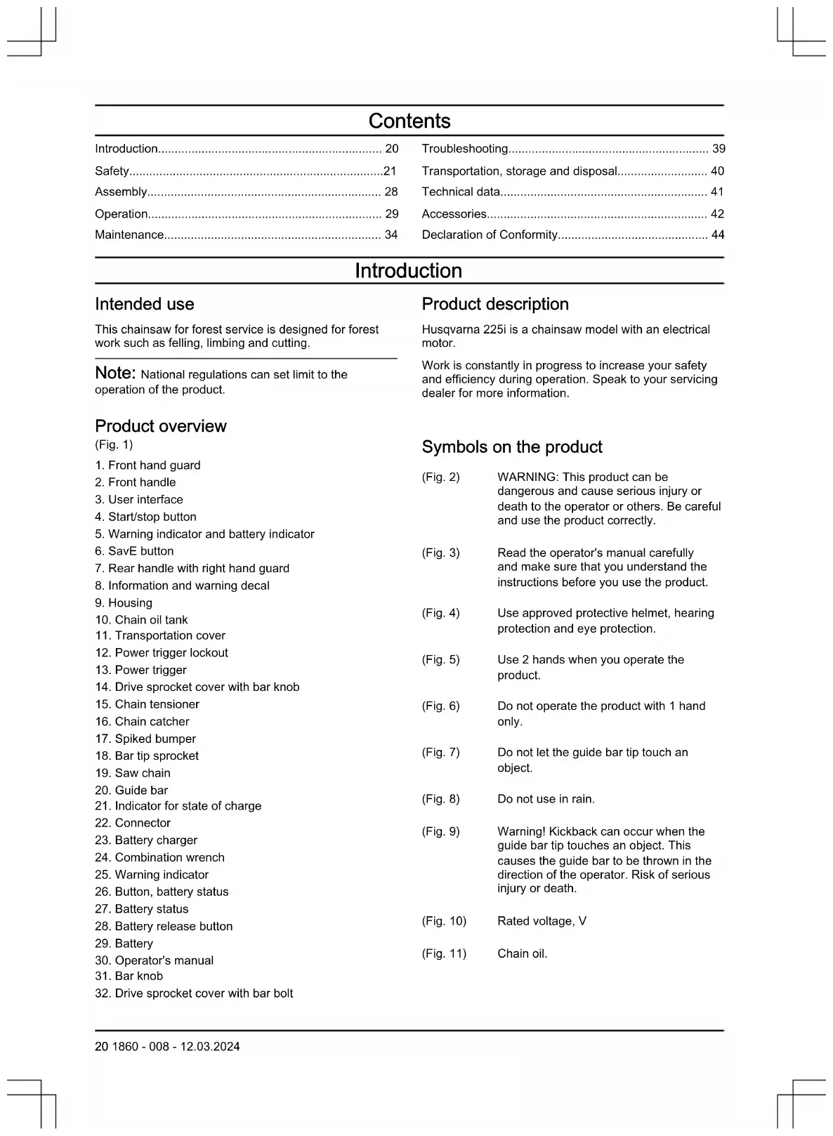 dangerous and cause serious injury or death to the operator or others. Be careful and use the product correctly. (Fig. 3) Read the operator's manual carefully and make sure that you understand the instructions before you use the product. (Fig. 4) Use approved protective helmet, hearing protection and eye protection. (Fig. 5) Use 2 hands when you operate the product. (Fig. 6) Do not operate the product with 1 hand only. (Fig. 7) Do not let the guide bar tip touch an object. (Fig. 8) Do not use in rain. (Fig. 9) Warning! Kickback can occur when the guide bar tip touches an object. This causes the guide bar to be thrown in the direction of the operator. Risk of serious injury or death. (Fig. 10) Rated voltage, V (Fig. 11) Chain oil. 20 1860 - 008 - 12.03.2024(Fig. 12) The direction in which the saw chain rotates and maximum length of the guide bar. (Fig. 13) Direct current. (Fig. 14) Environmental mark. The product or package of the product is not domestic waste. Recycle it at a recycling station for electrical and electronic equipment. (Fig. 15) This product complies with applicable EC Directives. (Fig. 16) This product complies to the applicable UK regulations. (Fig. 17) Noise emission to the environment label as per European Directive 2000/14/EC, UK directives and regulations and New South Wales legislation "Protection of the Environment Operations (Noise Control) Regulation 2017". The guaranteed sound power level of the product is specified in Technical data on page 41 and on the label. (Fig. 21) Chain brake, engaged (for- ward). Chain brake, disen- gaged (rearward). (Fig. 22) Chain direction. (Fig. 23) The rating plate shows se- rial number. yyyy is the production year, ww is the production week. Note: Other symbols/decals on the product refer to certification requirements for some markets. Symbols on the battery and/or on the battery charger (Fig. 24) Recycle this product at a recy- cling station for electrical and electronic equipment. (Applies to Europe only) (Fig. 18) Fail-safe transformer. (Fig. 19) Use and keep the battery charger indoors only. (Fig. 20) Double insulation. Manufacturer Husqvarna AB Drottninggatan 2, SE-561 82, Huskvarna, Sweden, tel: +46-36-146500 Product damage We are not responsible for damages to our product if: