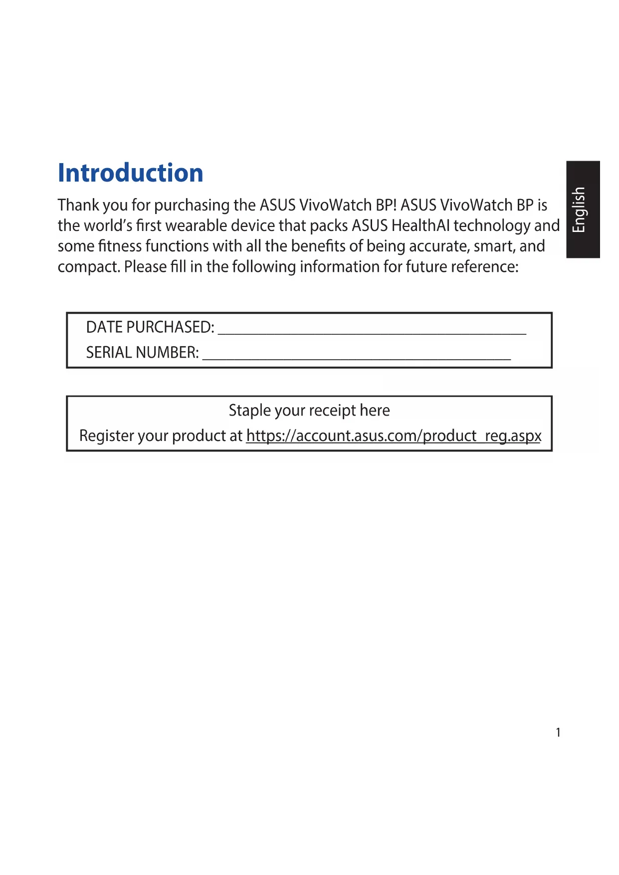 Getting started8 English Getting to know your ASUS VivoWatch BP