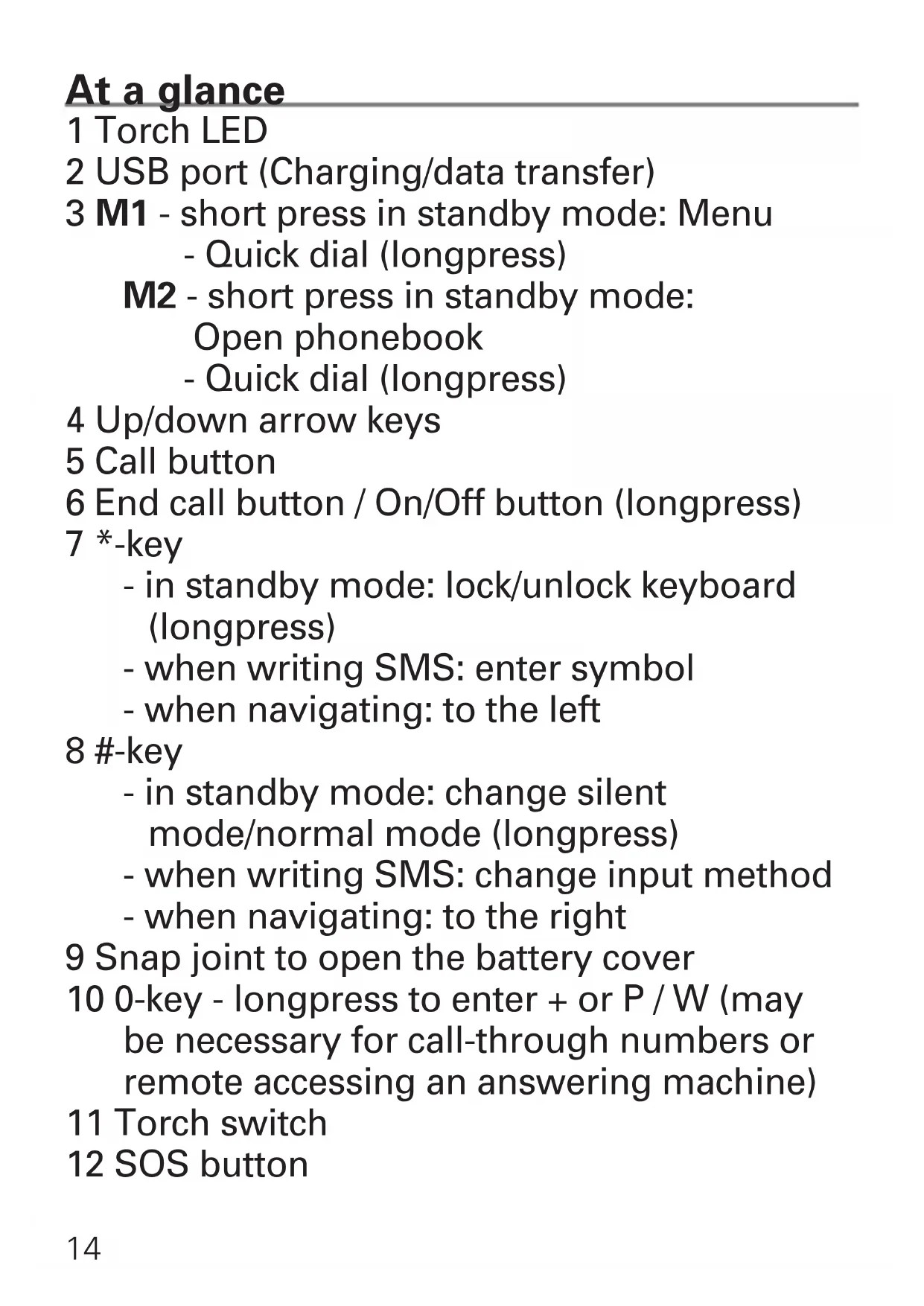 - Replace the battery when the battery power has decreased noticeably. Disposal In order to dispose of your device, take it to a collection point provided by your local public waste authorities (e.g. recycling centre). According to laws on the disposal of electronic and electrical devices, owners are obliged to dispose of old electronic and electrical devices in a separate waste container. The symbol indicates that the device must not be disposed of in normal domestic waste! Batteries represent a hazard to health and the environment! 24Never open, damage or swallow batteries or allow them to pollute the environment. They may contain toxic, ecologically hazardous heavy metals. You are legally obliged to dispose of power packs and batteries at the point of sale or in the corresponding containers provided at collection points by local public waste authorities. Disposal is free of charge. The symbols indicate that the batteries must not be disposed of in normal domestic waste and that they must be brought to collection points provided by local public waste authorities. Packaging materials must be disposed of according to local regulations. Declaration of Conformity This device fulfils the requirements stipulated in the EU directive: 2014/53/EU. Conformity with the above mentioned directive is confirmed by the CE mark on the device. To view the complete Declaration of Conformity, please refer to the free download available on our web site www.amplicomms.com Technical data Quad-Band 850/900/1800/1900 MHz Additional functions emergency call function Battery Li-Ion, BL-4D, 3.7 V, 900 mAh Talk time up to 5 - 6 hours Standby time up to 15 - 20 days 25Dimensions 113.2 x 54 x 13.2 mm Weight 50 g (without battery) Netzgerät APS DIGITECH HOLDINGS LTD Input: 100...240 VAC / 50/60 Hz / 150 mA Output: 5 VDC / 600 mA USB connection Micro USB, EU Standard SAR values Head 0.581 W/kg Body 1.27 W/kg Guarantee AMPLICOMMS equipment is produced and tested according to the latest production methods. The implementation of carefully chosen materials and highly developed technologies ensure trouble−free functioning and a long service life. The terms of guarantee do not apply when a device malfunction was caused by the mobile telecommunications network operator/provider. The terms of guarantee do not apply to the batteries or power packs used in the products. The period of guarantee is 24 months from the date of purchase. All deficiencies related to material or manufacturing errors within the period of guarantee will be redressed free of charge. Rights to claims under the terms of guarantee are annulled following tampering by the purchaser or third parties. Damage caused as a result of improper handling or operation, normal wear and tear, incorrect positioning or 26storage, improper connection or installation or Acts of Gods and other external influences are excluded from the terms of guarantee. In the case of complaints, we reserve the right to repair defective parts, replace them or replace the entire device. Replaced parts or devices become our property. Rights to compensation in the case of damage are excluded where there is no evidence of intent or gross negligence by the manufacturer. If your device shows signs of defect during the period of guarantee, please return it to the sales outlet in which you purchased the AMPLICOMMS device together with the purchase receipt. All claims under the terms of guarantee in accordance with this agreement can only be asserted at the sales outlet. No claims under the terms of guarantee can be asserted after a period of two years from the date of purchase and hand−over of the product. Service hotline In the event of technical problems, please contact our service hotline under tel. 0844 800 6503 (Using a UK landline, at the time of going to print: calls cost 6p for connection charge and then 5p a minute. Mobile costs may vary.) In the case of claims under the terms of gua- rantee, contact your sales outlet. There is a 2 year period of guarantee. 27Notice succincte 1 LED lampe de poche 2 Raccordement USB (chargement/transfert des données) 3 M1 - en mode veille, appui court : menu - touche appel abrégé (appui long) M2 - en mode veille, appui court : ouvrir le répertoire - touche appel abrégé (appui long) 4 Touches flèche vers le haut/bas 5 Touche d’appel 6 Touche raccrocher / Touche ON/OFF (appui long) 7 Touche * - en mode veille : verrouillage clavier ON/OFF (appui long) - pour SMS : insérer signe spécial / symbole - pour navigation/sélection : vers la gauche 8 Touche # - en mode veille : commutation mode de repos / mode normal (appui long) - pour SMS : modifier la méthode de saisie - pour navigation/sélection : vers la droite